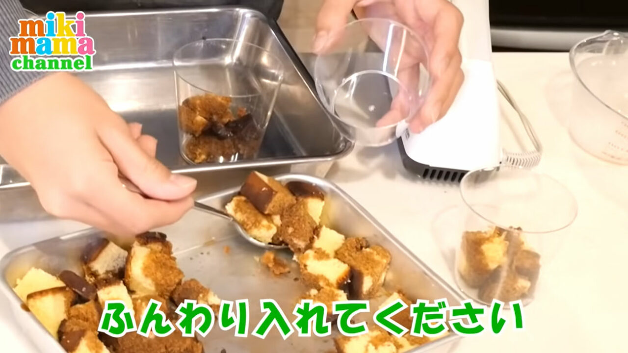 カップの底に土台となるカステラを入れます。カステラは潰さずふんわりと入れるのがコツだとみきママ。