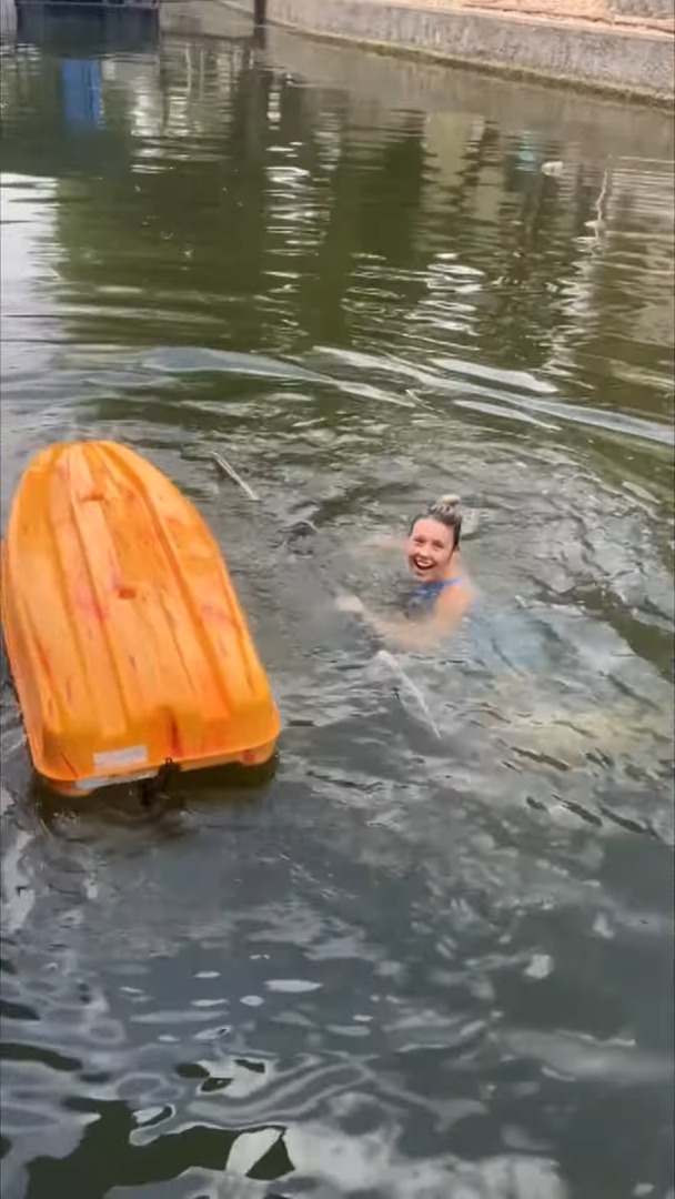 乗り込むことに成功したかと思いきや、出発を前に落水してしまった女性。