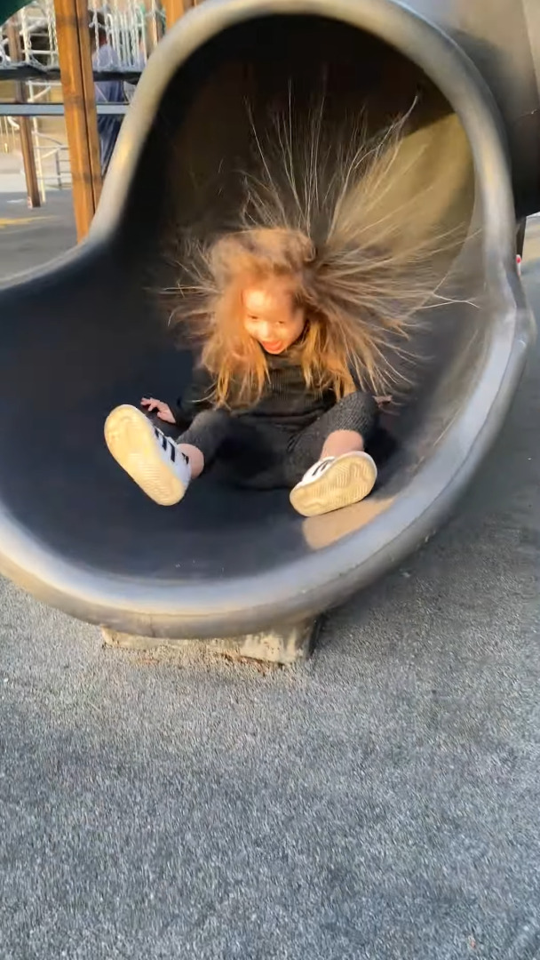 トンネル型のすべり台から滑りおりてきた女の子の髪が静電気で凄いことに!