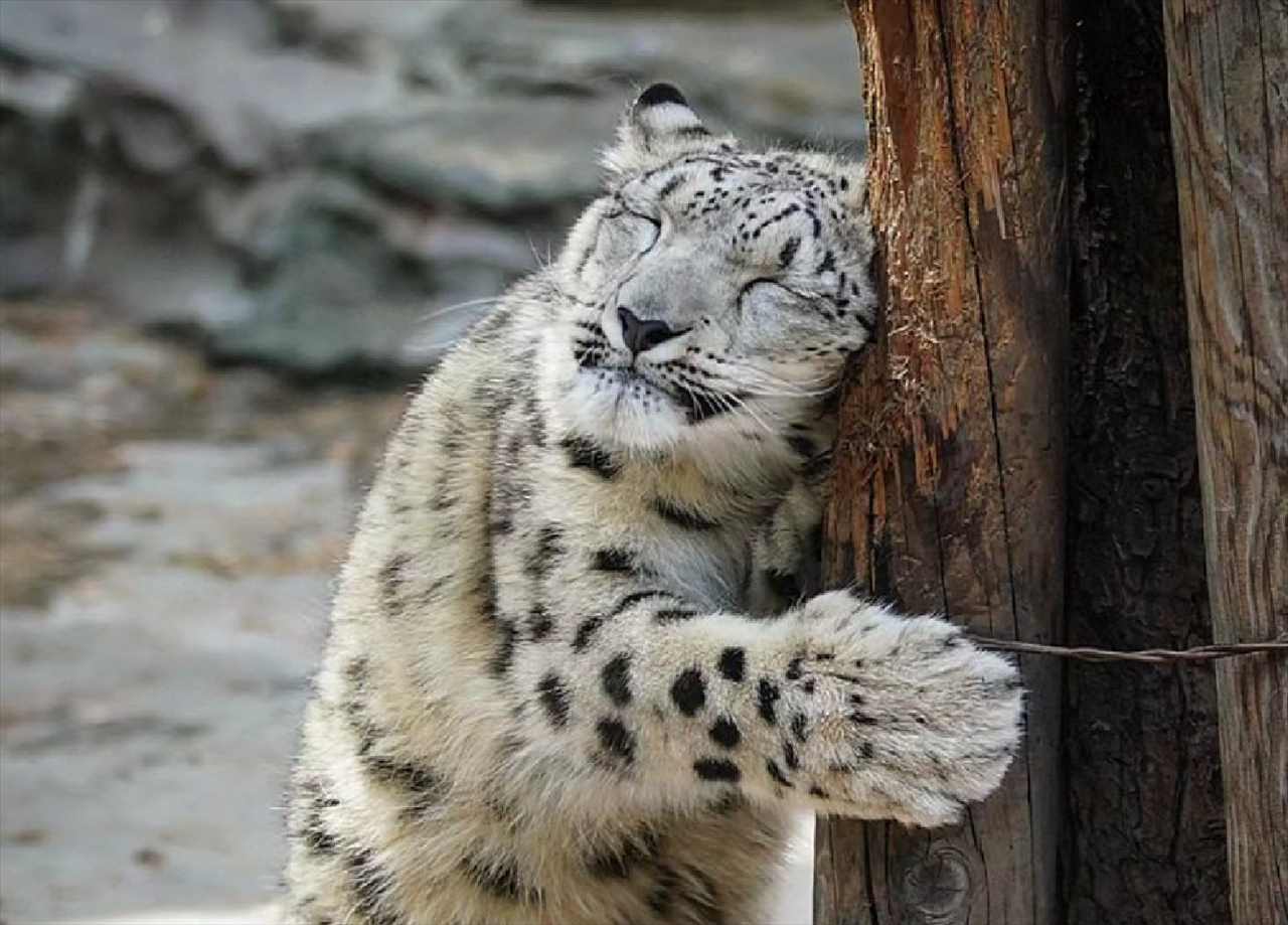 木に顔をスリスリする、幸せそうな表情とポーズが可愛すぎるユキヒョウがTwitterで話題になっています!