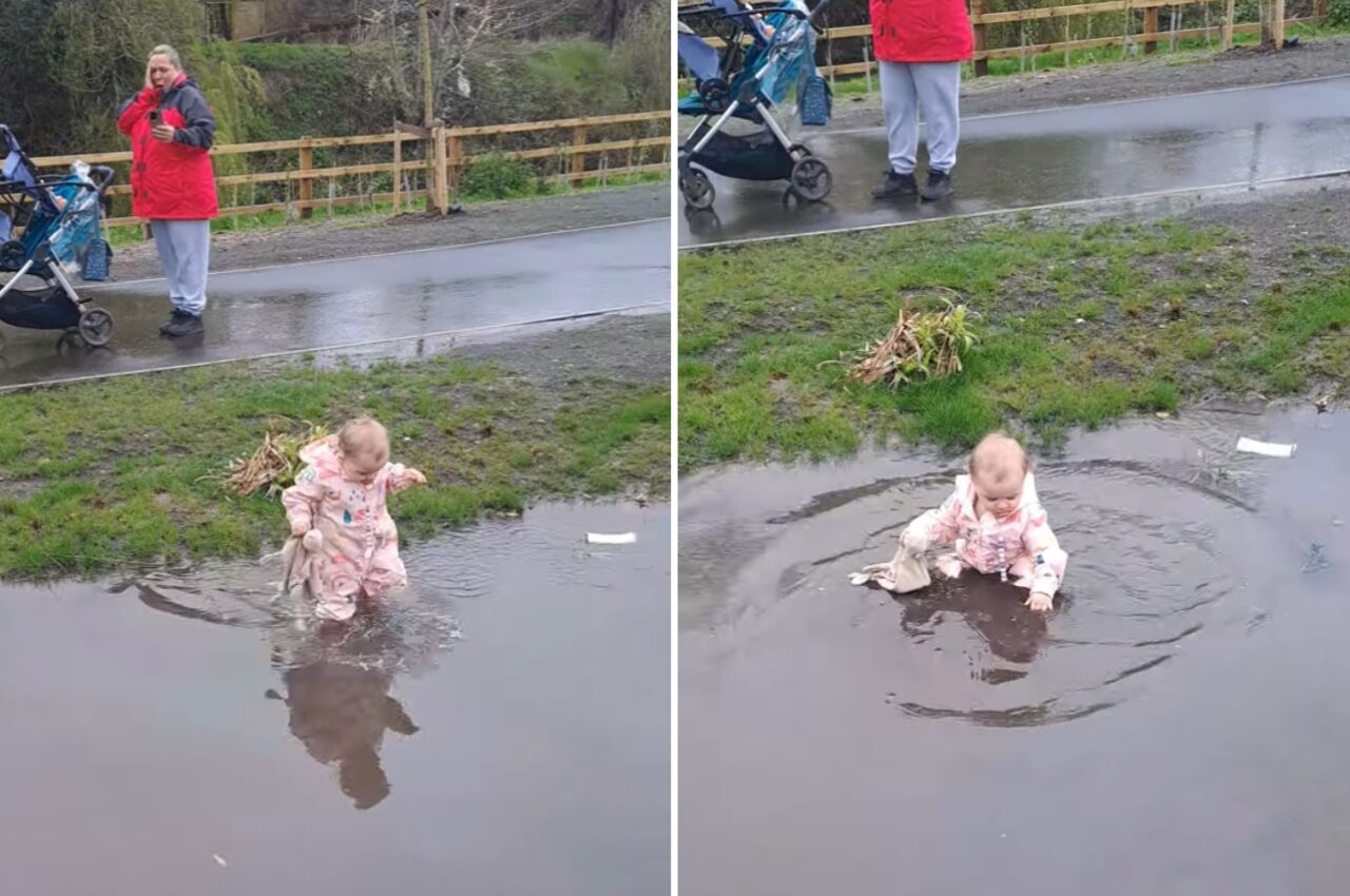 イギリス・カーディフの屋外で撮影された動画は、赤ちゃんが大きな水たまりに近寄っていくシーンから始まります。