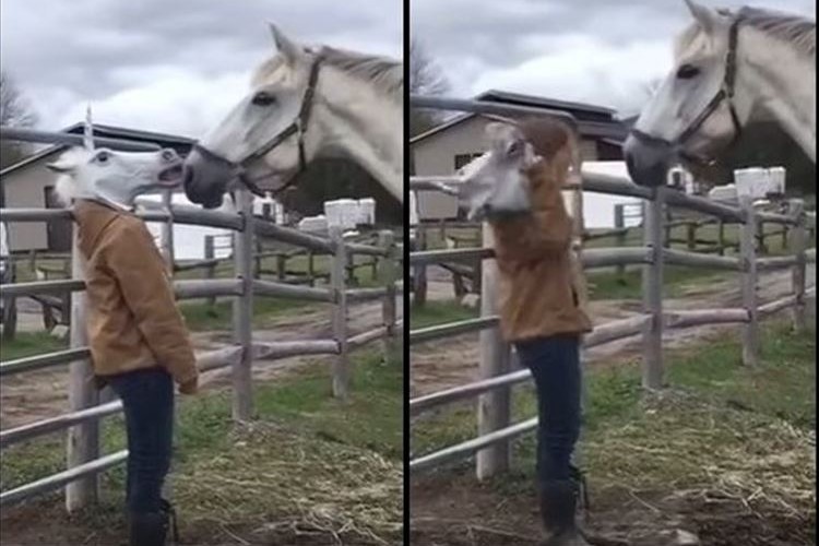 近年いろんな場面で目にすることが多い馬のマスク。このマスクを本物の馬に見せたらどうなるのか?実際にやってみたところ、馬は気に入ったのか、近づいてきました。しかし、馬の目の前でこの馬マスクをとってみたところ、馬は予想外の行動に!!