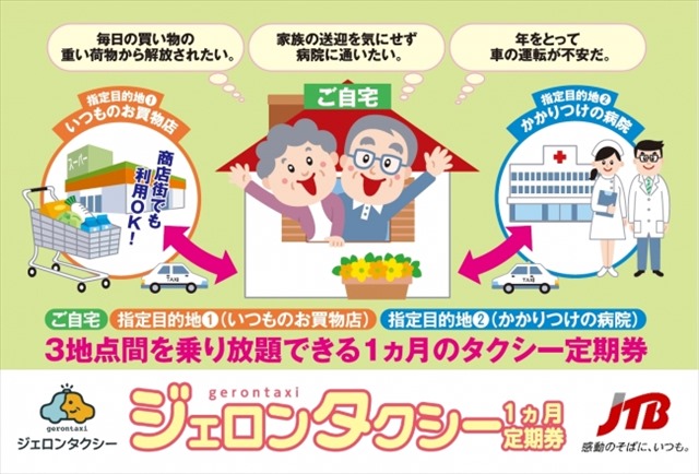 タクシー乗り放題のサービスと聞いただけでも画期的ですね。これは、JTBグループの株式会社JTB九州が考案した高齢者向け定額乗り放題の新タクシーサービス「JTBジェロンタクシー」と呼ばれるもの。自宅とかかりつけの病院、日々買物をする商店街やスーパーマーケットを指定目的地とする2地点をあらかじめ登録し、その間のタクシー移動を1ヵ月間定額乗り放題で利用できる定期券型のお出かけサポートサービスだそうです。