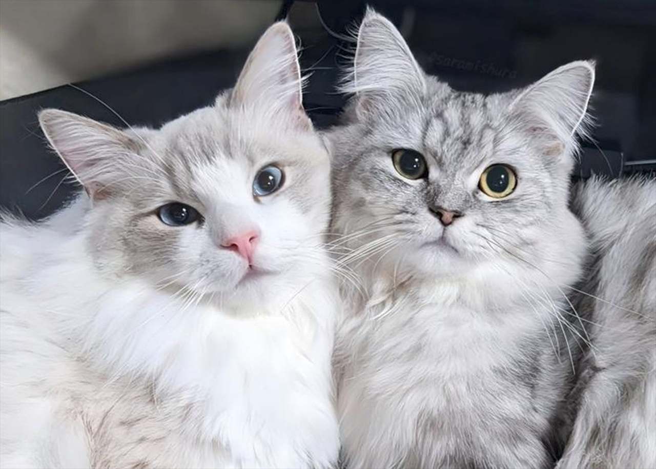 左側にいるのがラグドールの『りおら』くんで、右側にいるのがノルウェージャンの『しゅら』くん。