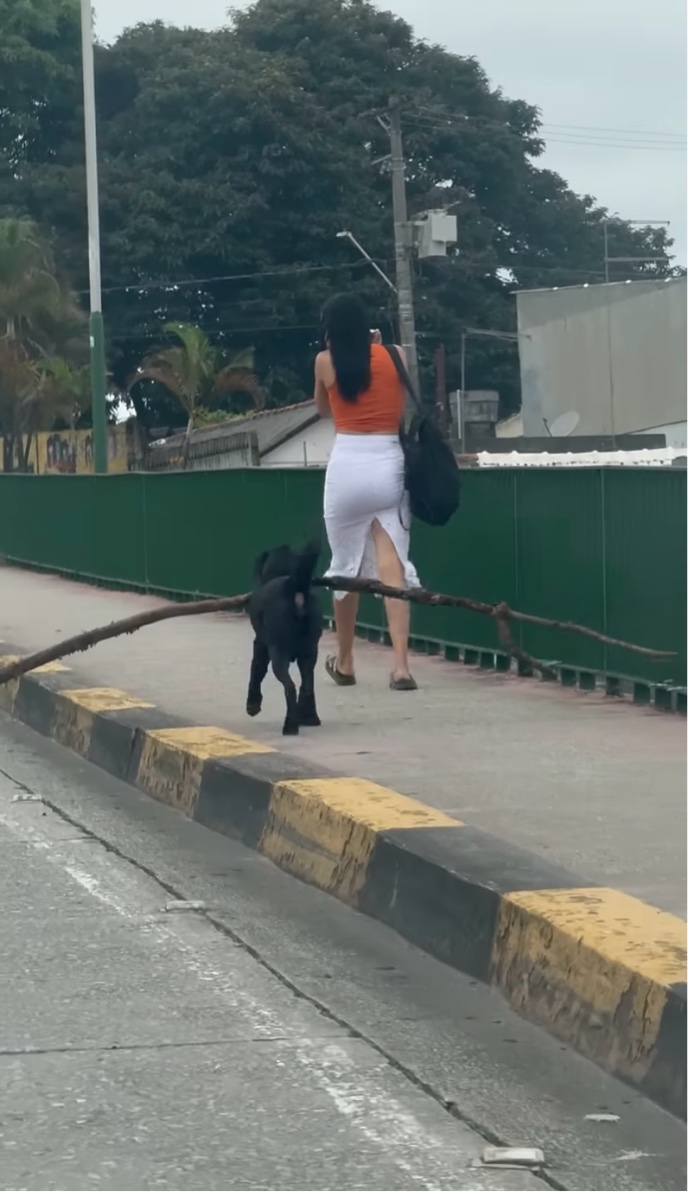 車に乗っていた撮影者さんは、歩道からはみ出すほど長い木の枝をくわえて歩くイヌを目撃しました。