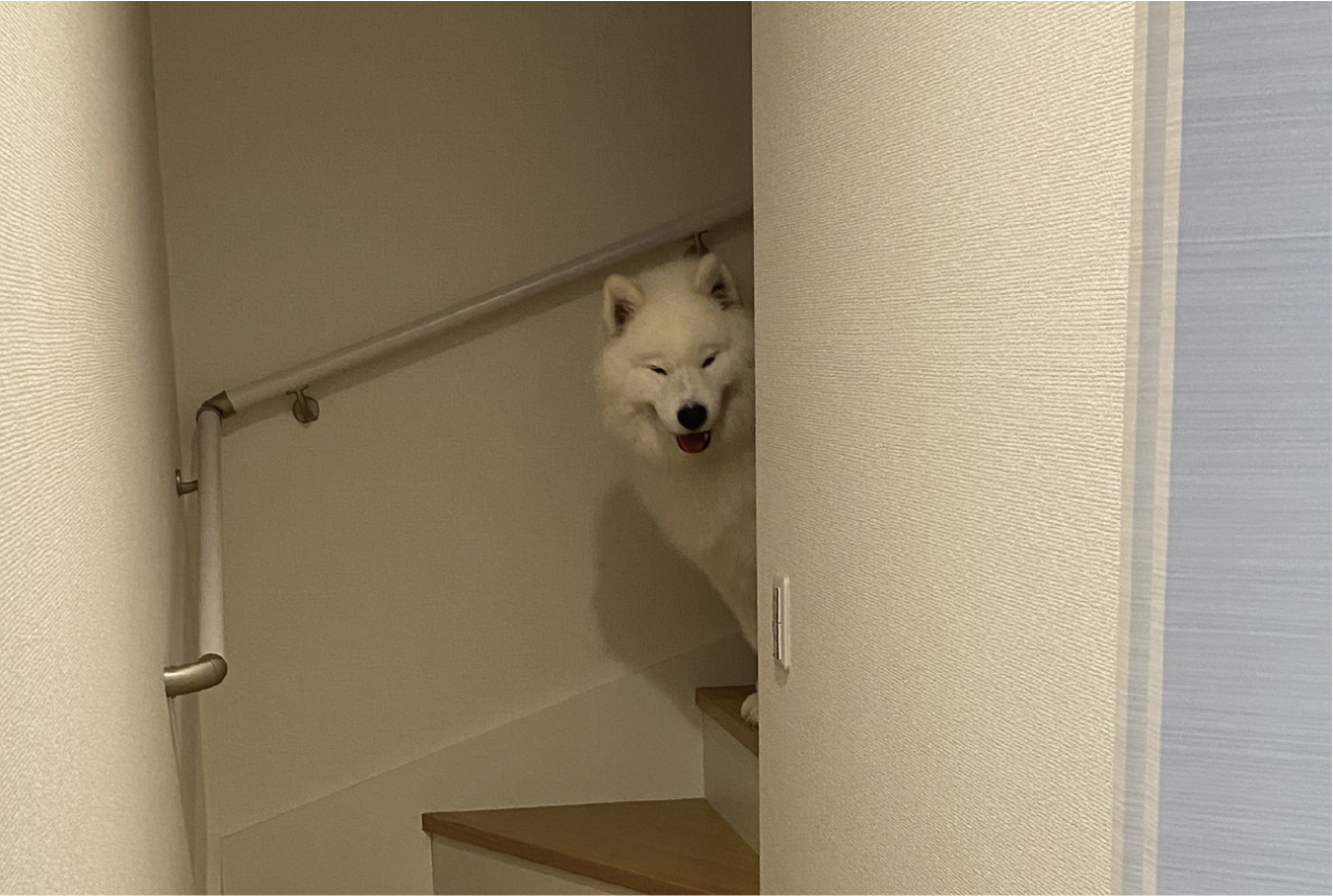 階段の奥から顔をのぞかせ、ニンマリとしているのはサモエドの『こはく』ちゃん。