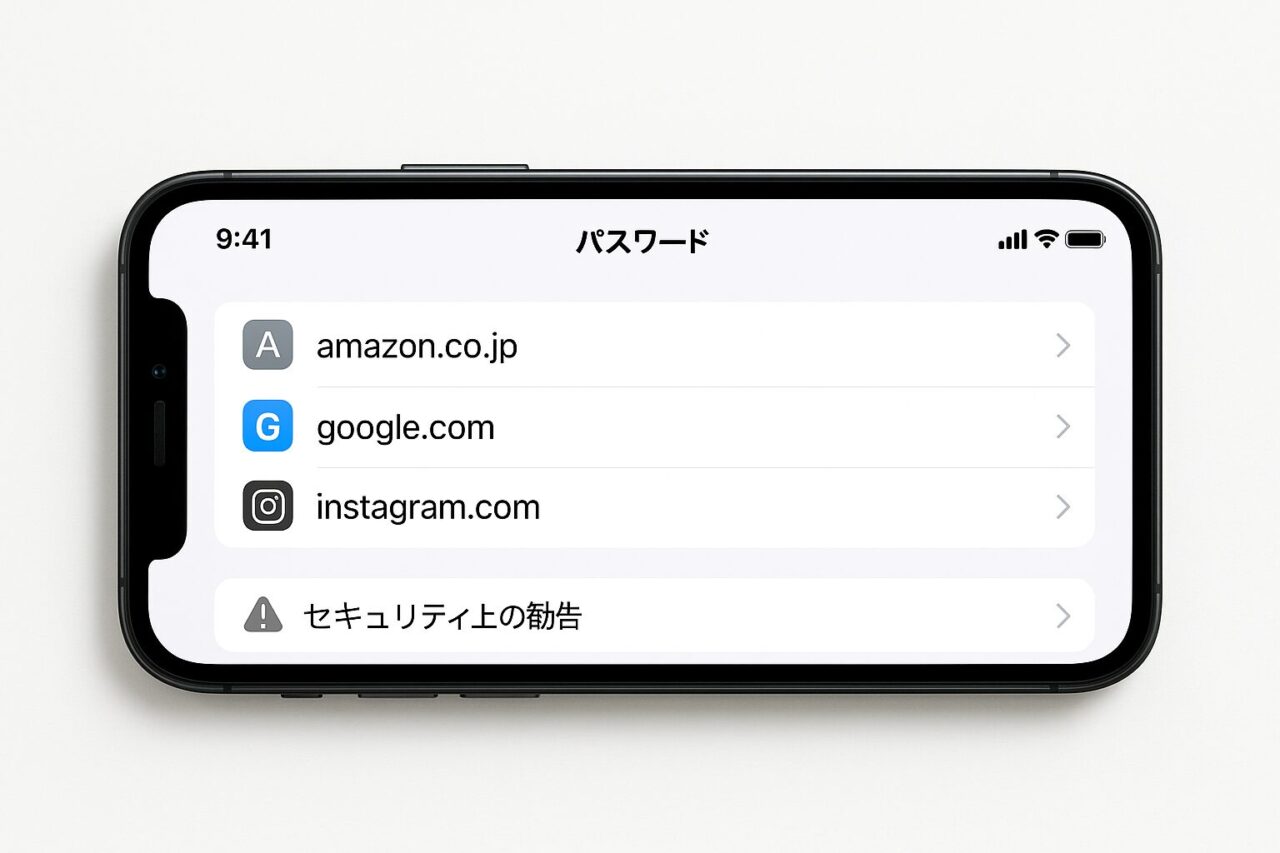 「設定」→「パスワード」を開くと、保存した ID・パスワードの一覧と「セキュリティ上の勧告」が確認できます。