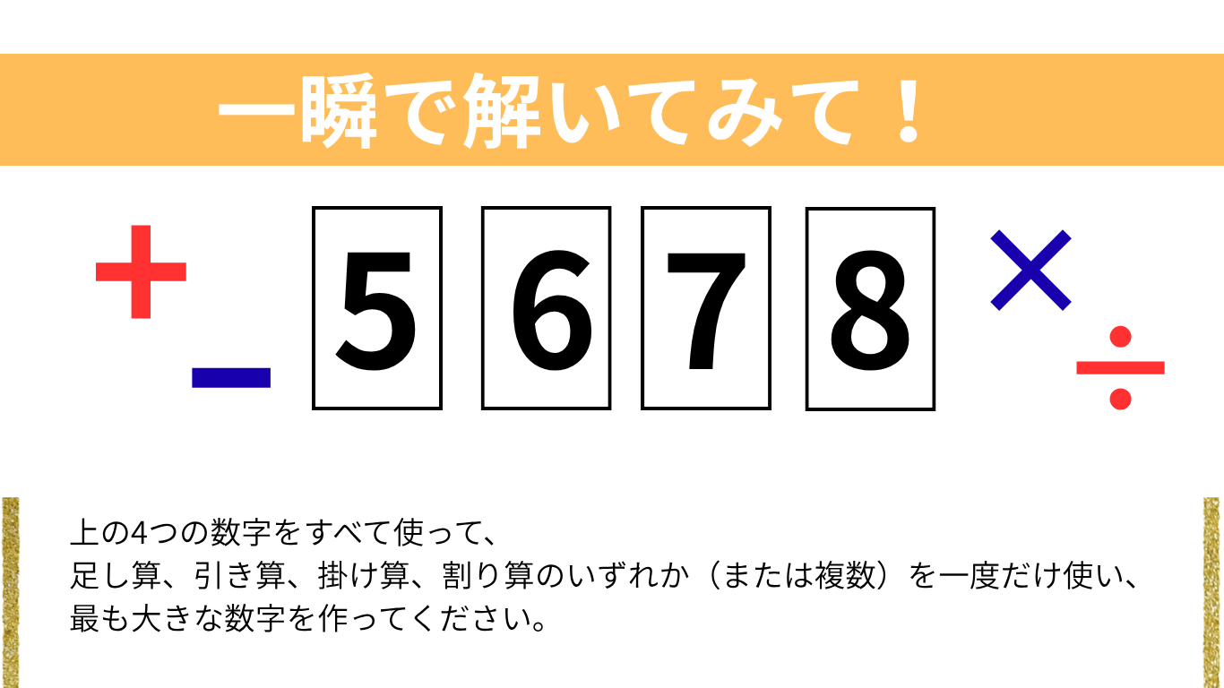 Q: 「5・6・7・8」をすべて1回ずつ使い、足し算・引き算・掛け算・割り算のいずれか(または複数)を使って、最も大きな数を作ってください。