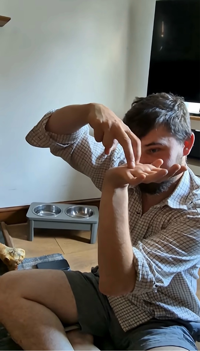 広げた手のひらの上で2本の指をテクテク動かし始めた飼い主さん。
