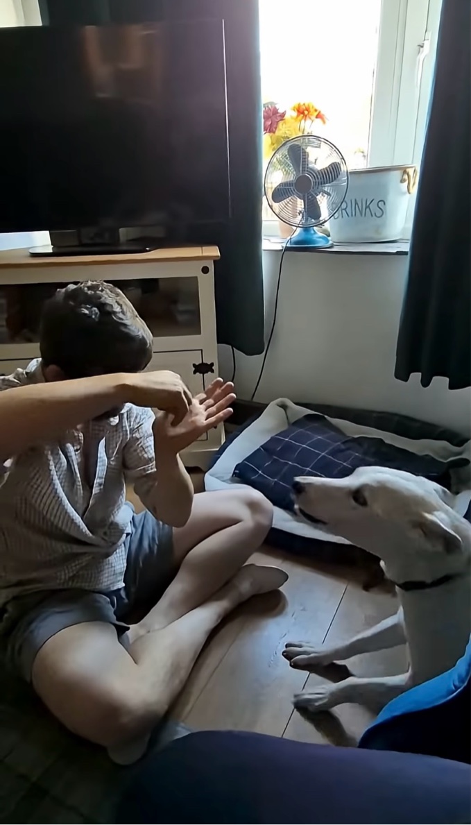 聴覚障害のある愛犬・ブルーノにジェスチャーを送る飼い主さん。