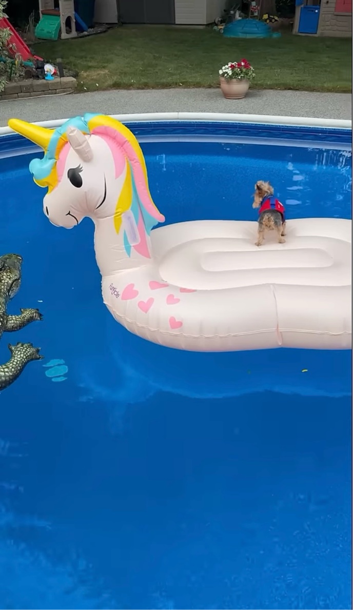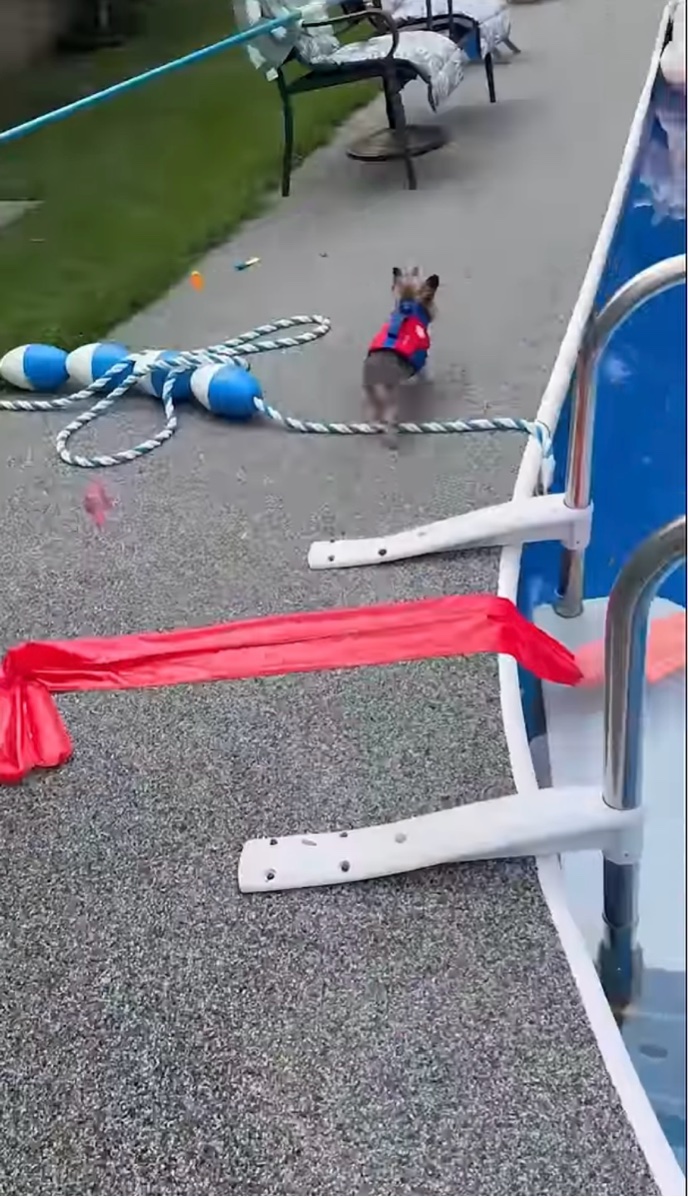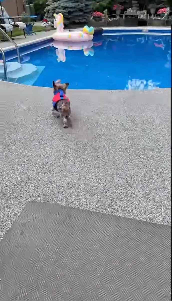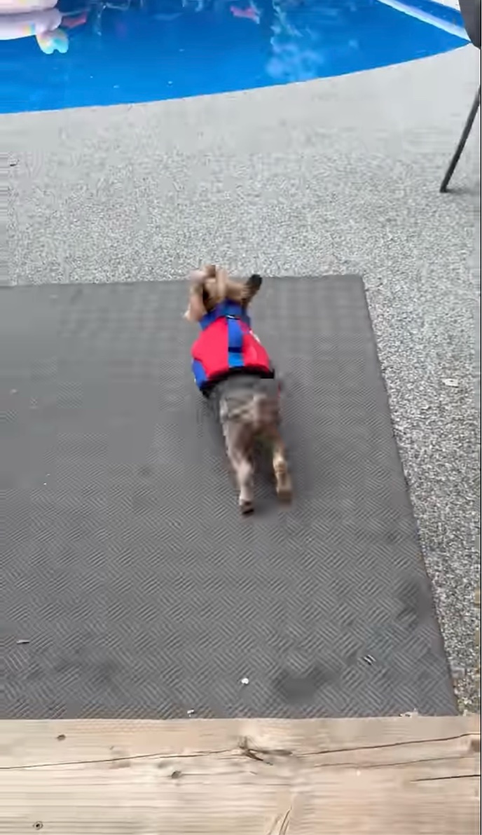 ライフジャケットを装着して、プールへ一直線に向かっていくヨークシャーテリア。