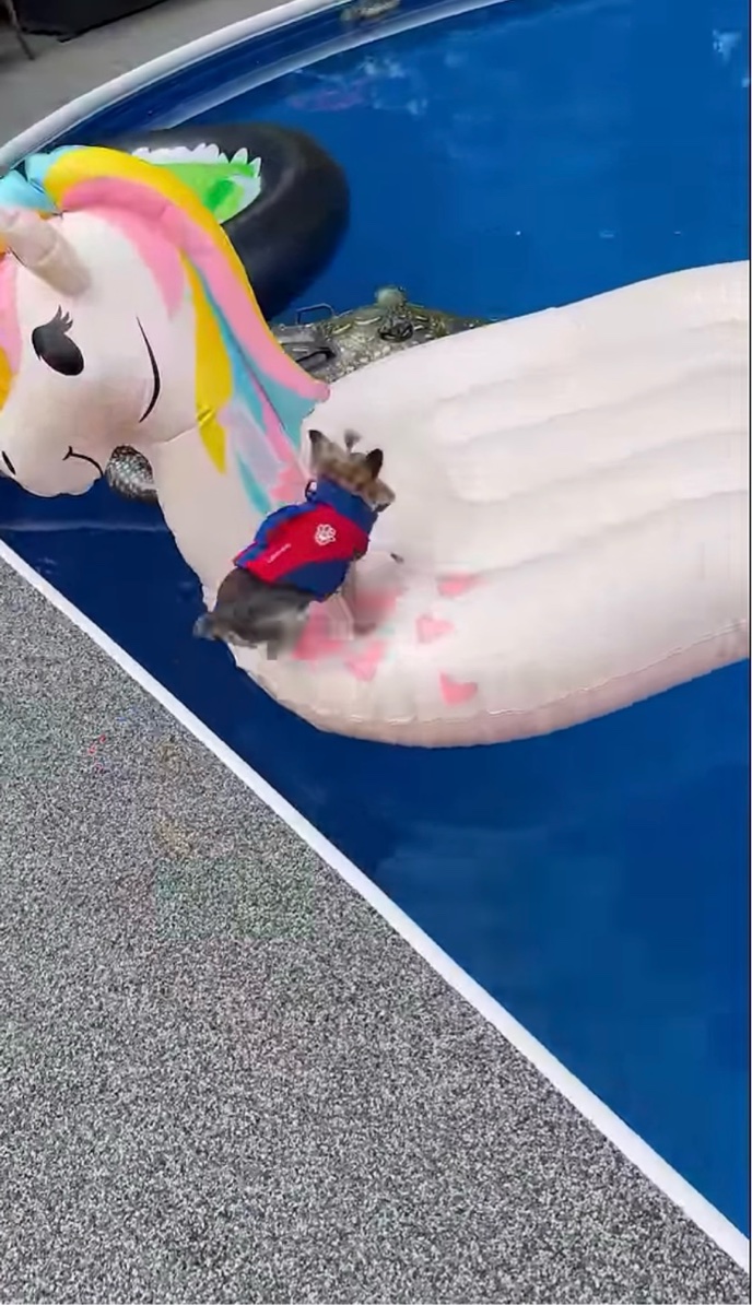 エアーマットに乗ってぷかぷかとプールを漂うエミリー。