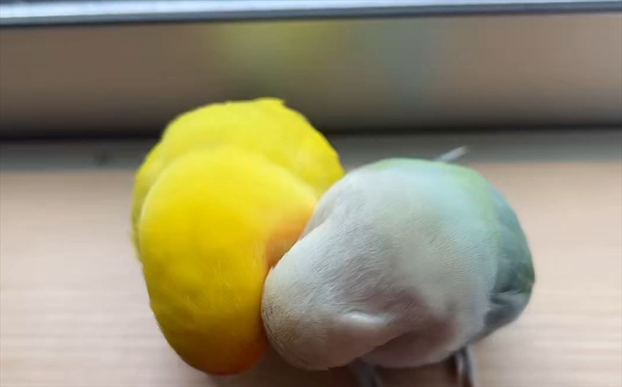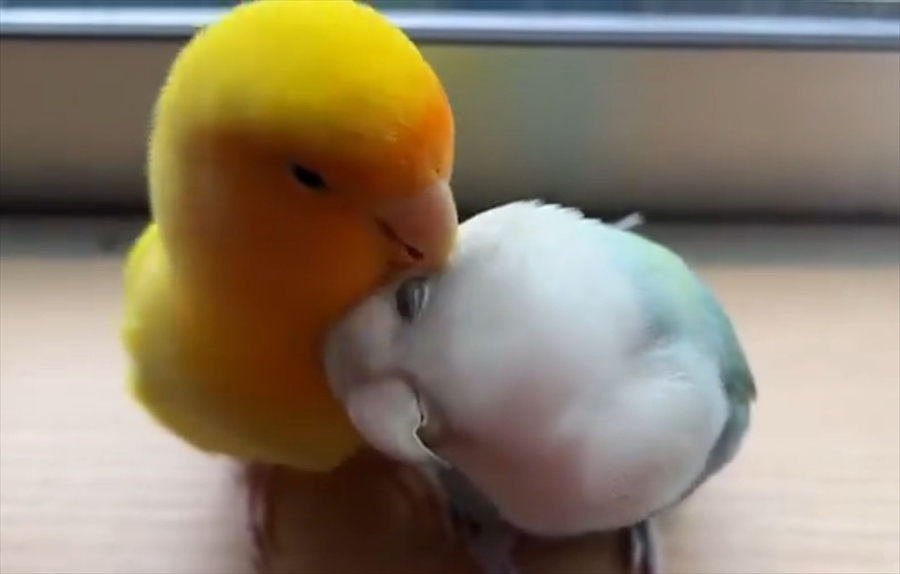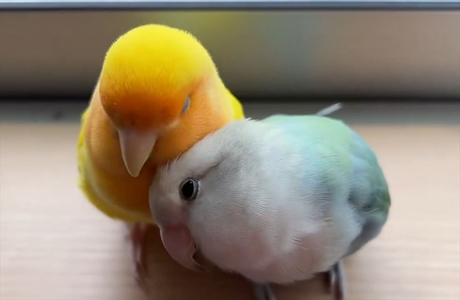 お互いに毛づくろいを求めていたインコたち。