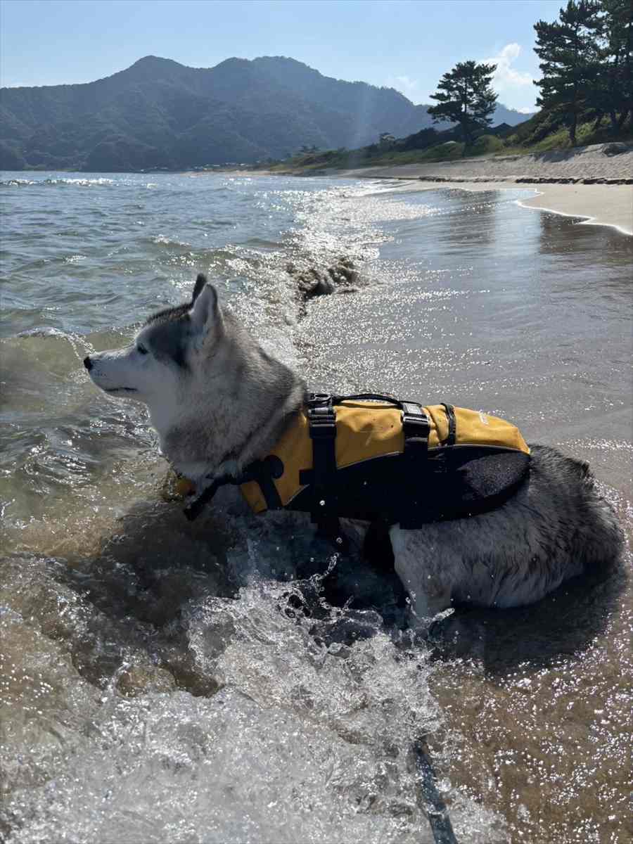 ライフジャケットを身にまとったこの子はハスキー犬の『はる』くん。