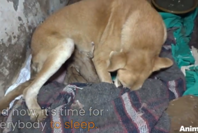 砂にまみれて真っ黒になっている我が子を愛おしそうにペロペロ舐める母犬。心から安心したことでしょう。