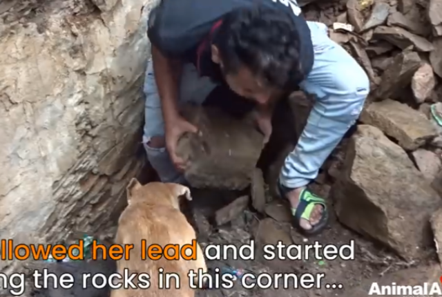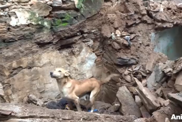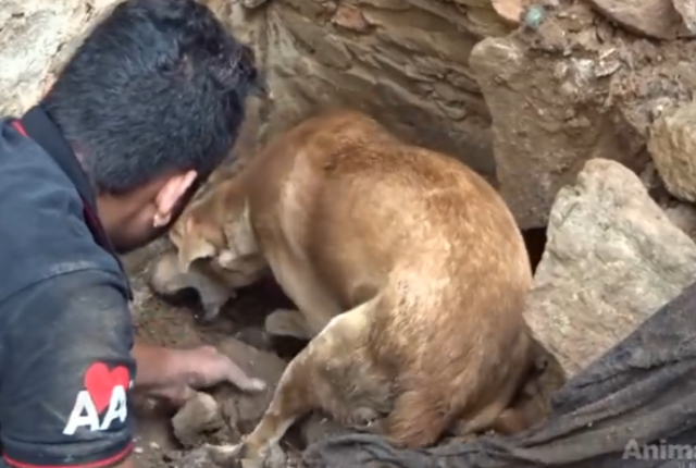 その現場で「母犬が必死に鳴いている」という通報を受けた動物保護団体・アニマルエイド・アンリミテッドのレスキュー隊が駆けつけたところ、瓦礫の下に生き埋めになってしまった子犬を必死で救出しようとする母親の姿がありました。