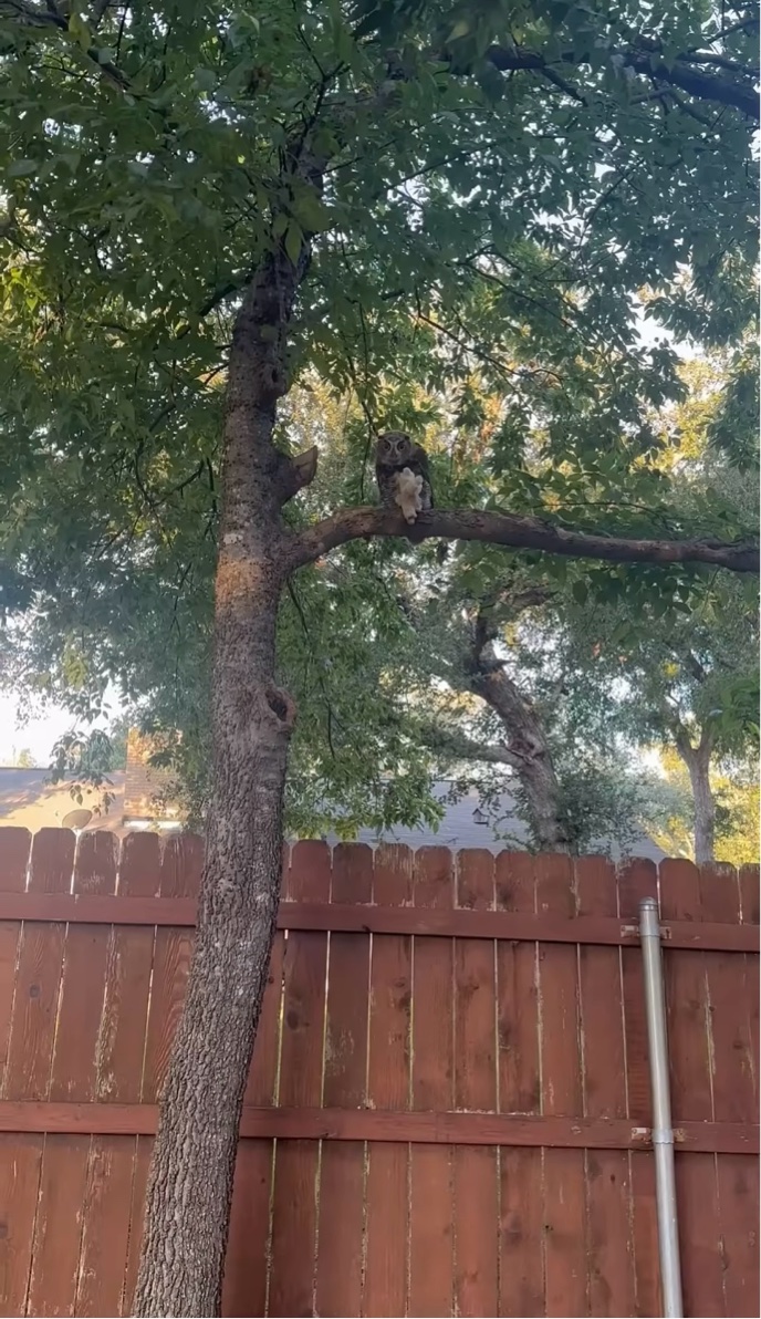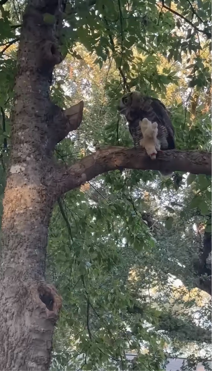 木の上で、フクロウが何かを大切そうに抱えているのを目撃した撮影者さん。