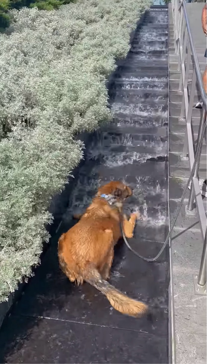 水が流れる階段の一番下で伏せをしている愛犬の姿を見つめる撮影者さん。