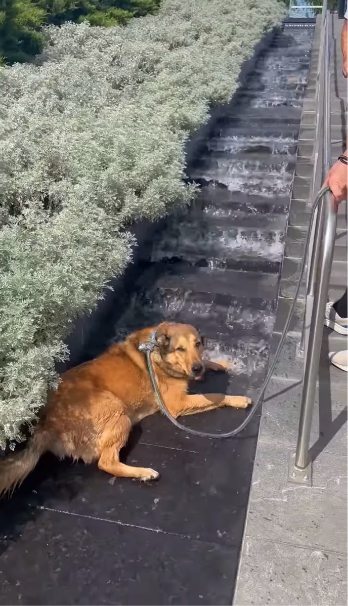 それもそのはず、この子が寝そべっているその場所は、滝のように水が流れる階段の最下段だったのです!