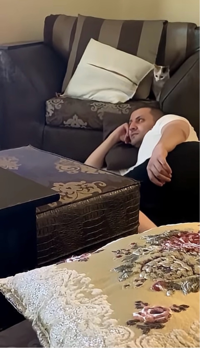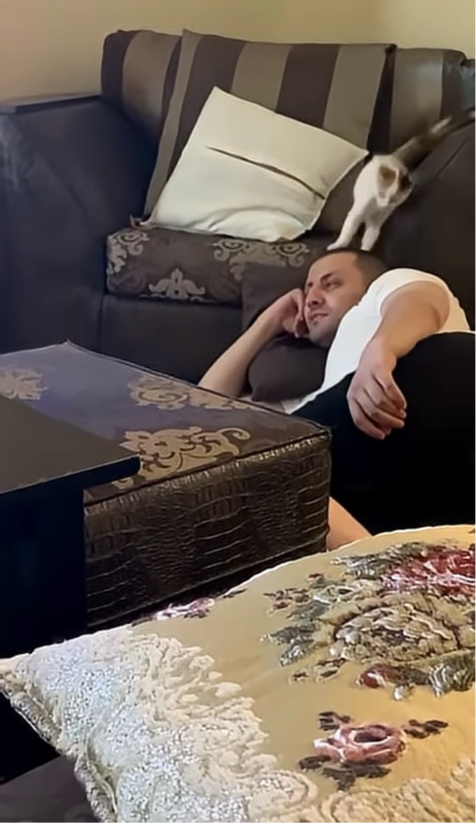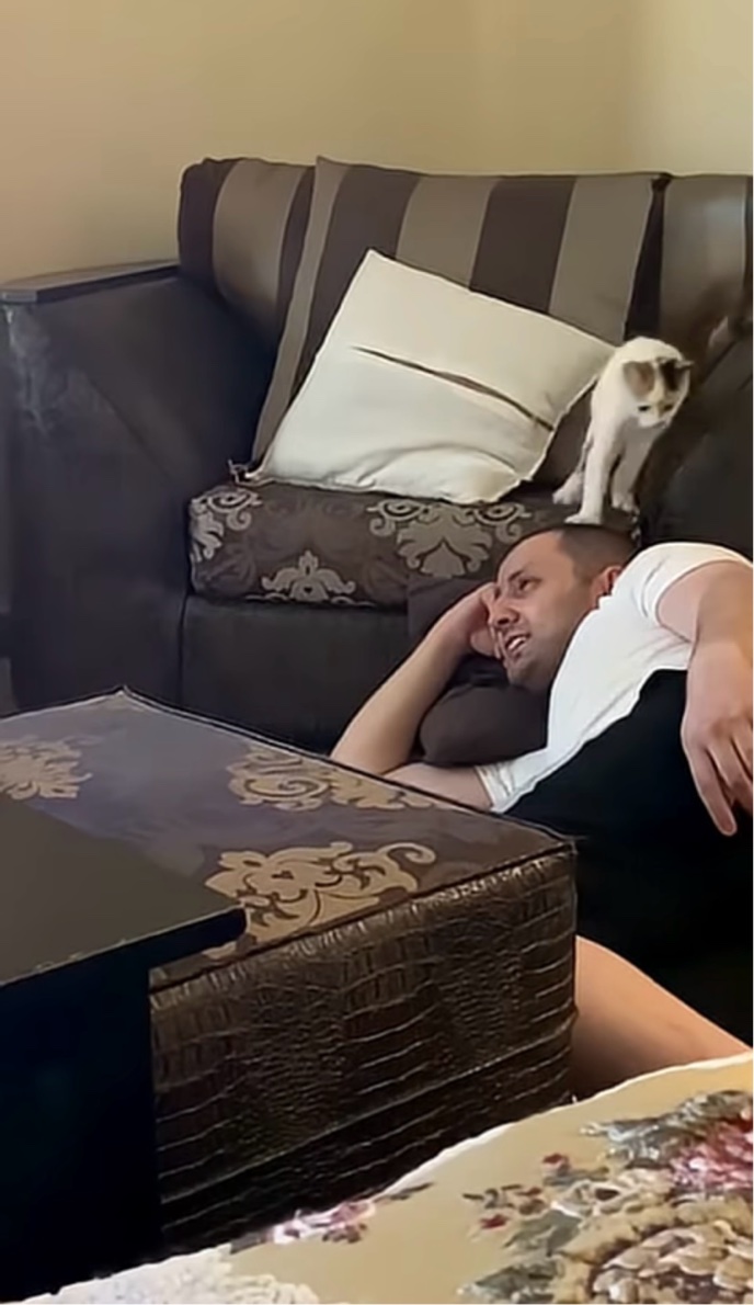 寝転ぶ飼い主さんの背後で、なにやらコソコソしている子猫。