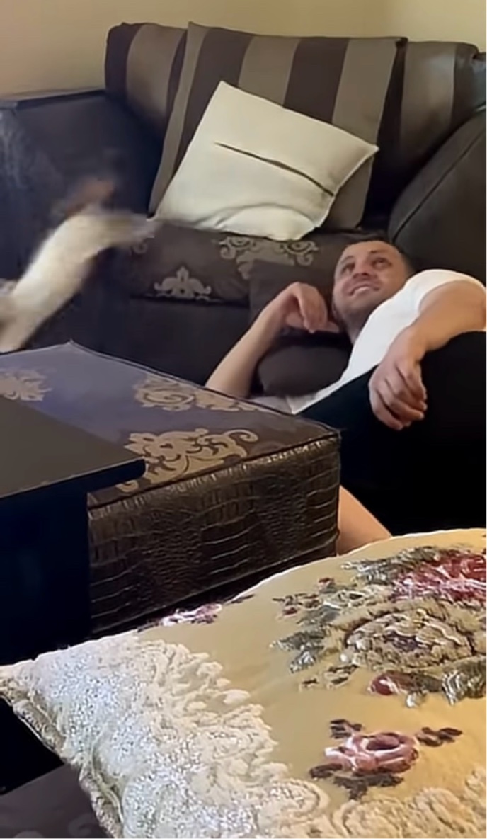 急いで逃げようとしたその時、飼い主さんの手がそっと伸びてきて、尻尾にタッチ返しをされてしまいました!