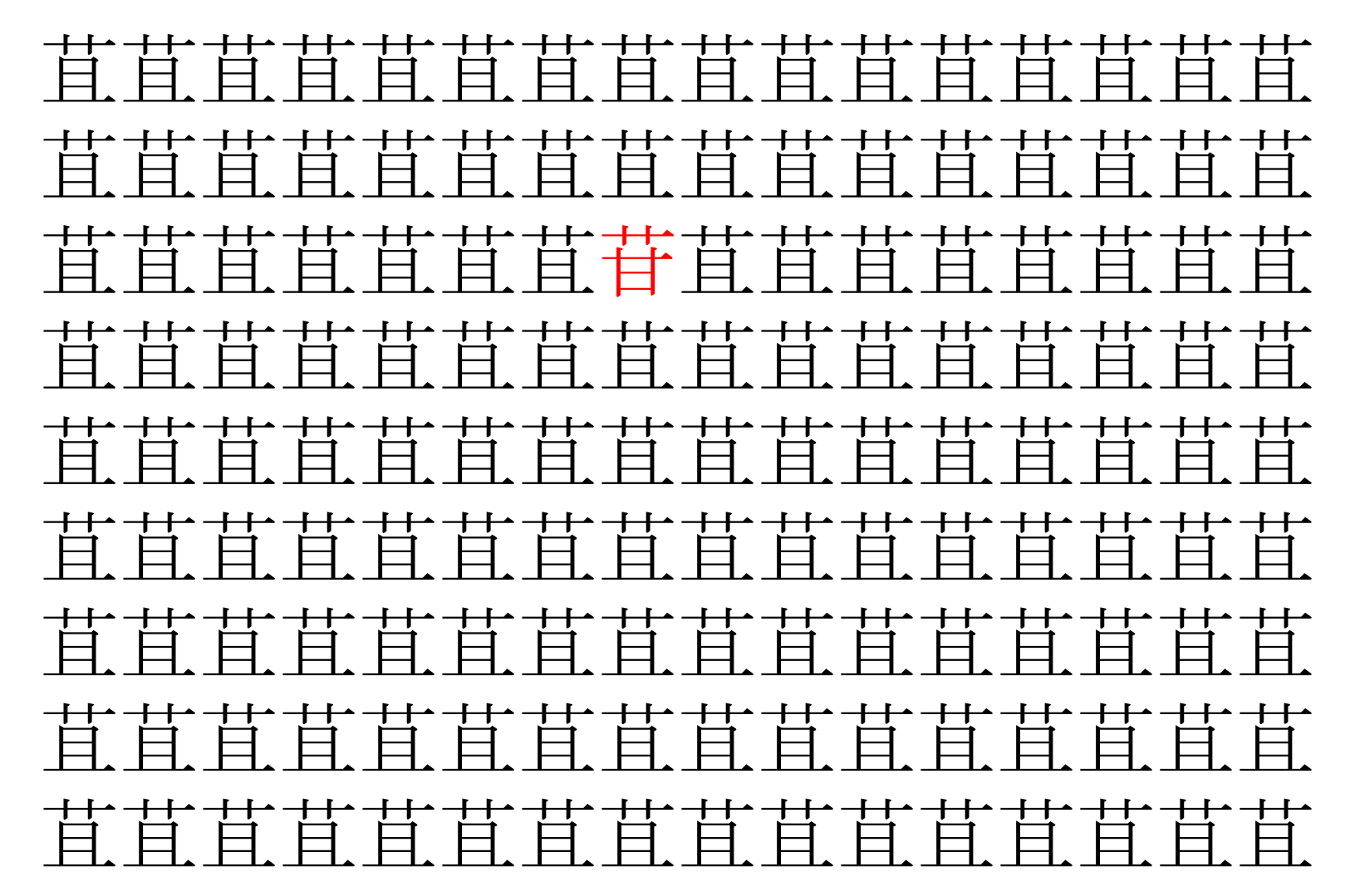 画像の中には、「苴」という漢字が縦に9行、横に16個並んでいます。