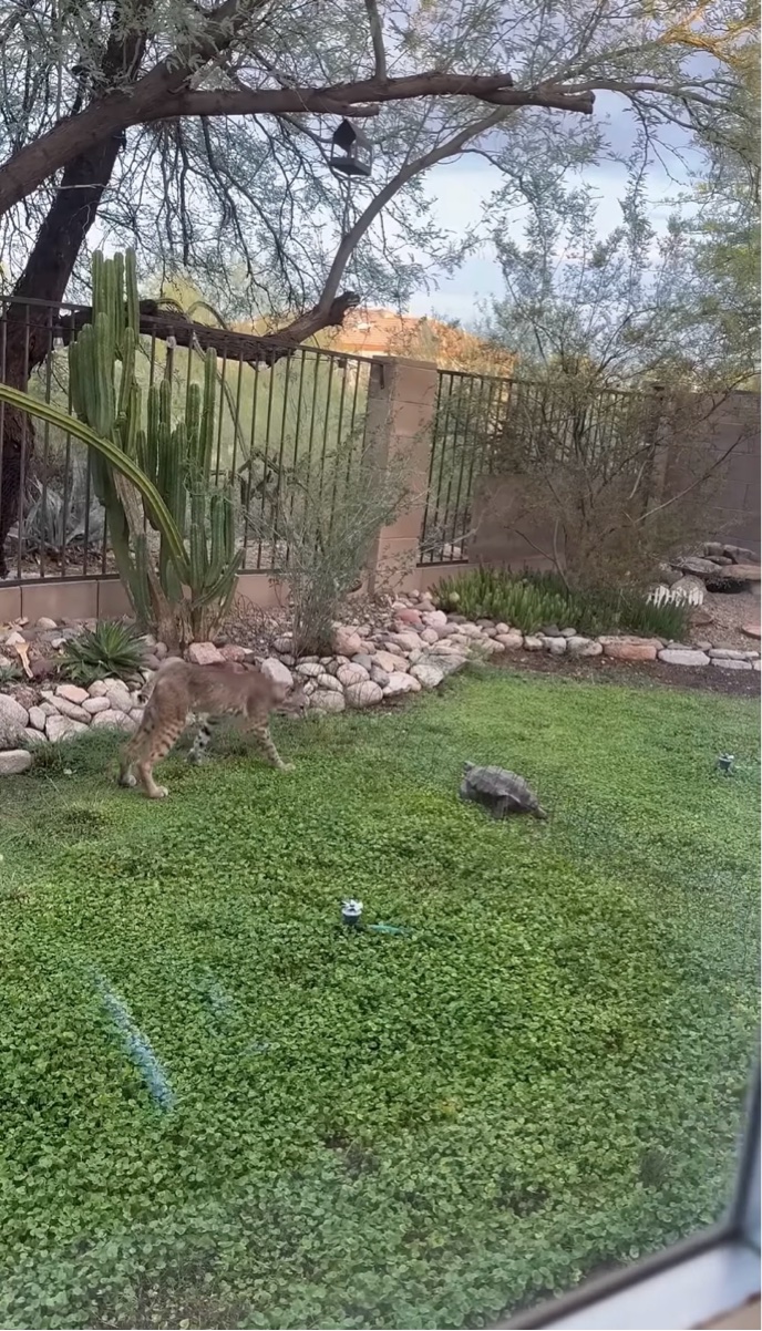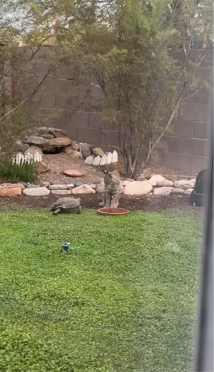 裏庭で目撃されたボブキャットとカメのツーショット。