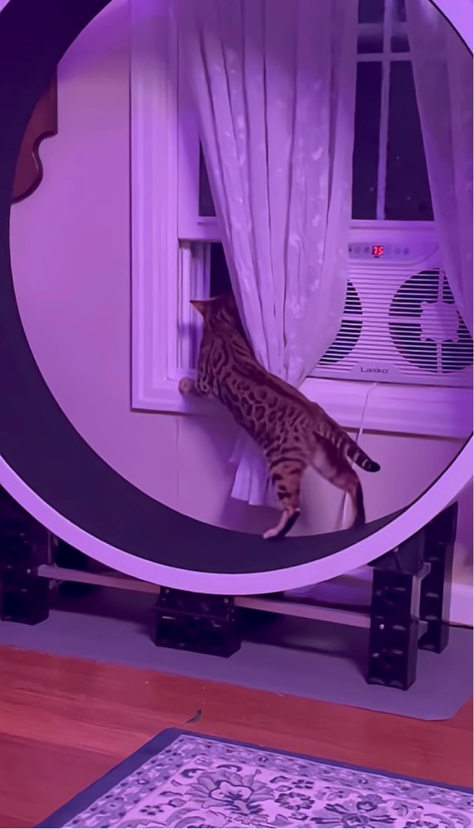 キャットホイールでせっせと歩いているネコですが、その視線は窓の外に釘付け。