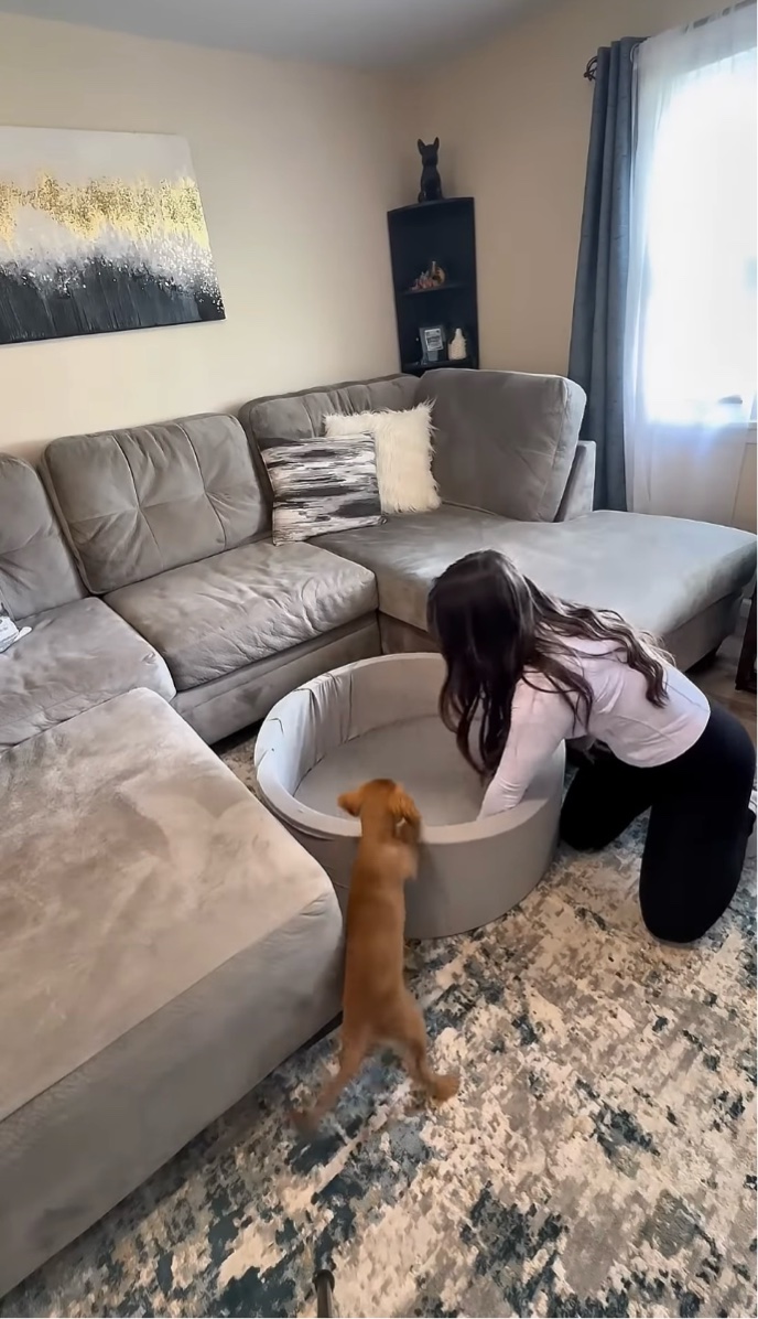 ソファの前にクッション製のプールのようなものを運び込む飼い主さん。