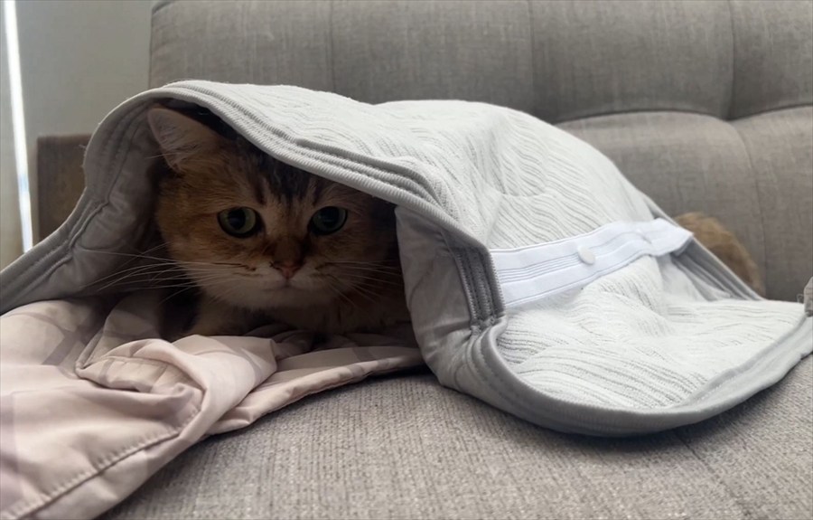 枕カバーを気に入って返してくれないネコ。