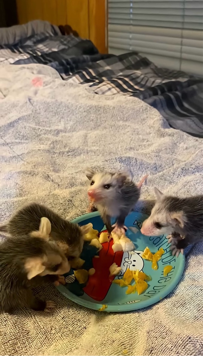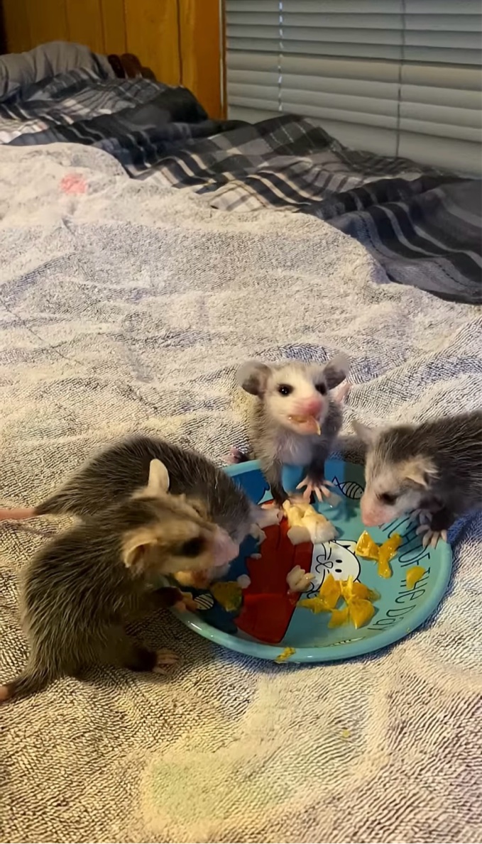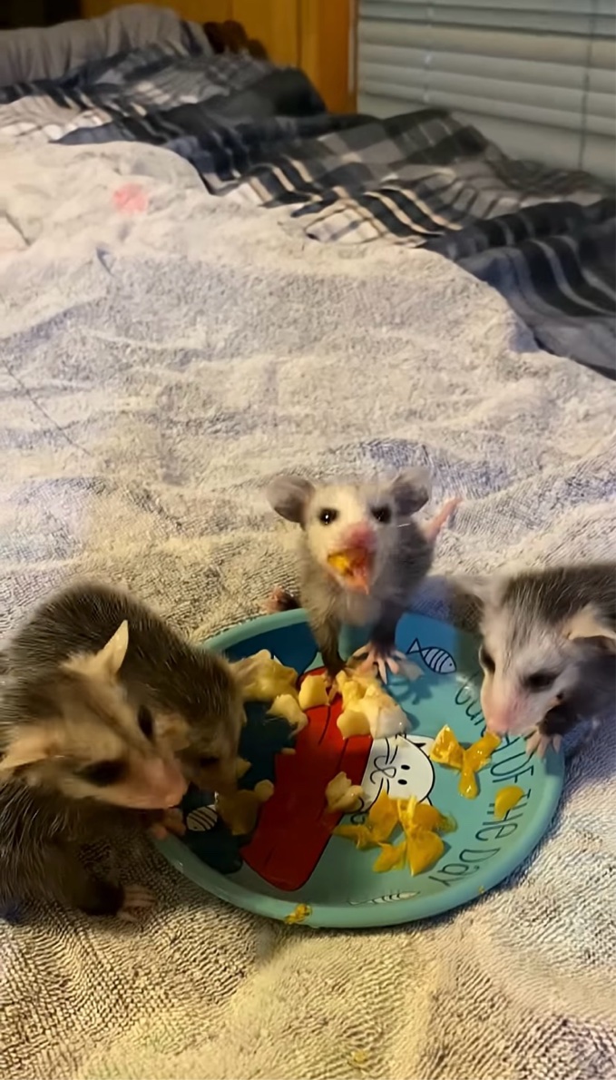 頭をフリフリ揺らしながら、モグモフとフルーツを頬張るオポッサムの赤ちゃんたち。