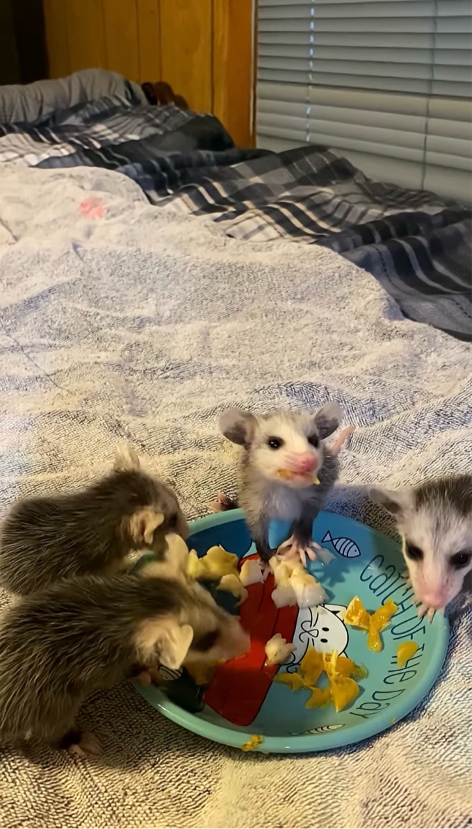 四方からお皿を囲んでいるこの子達は、オポッサムの赤ちゃんたち。