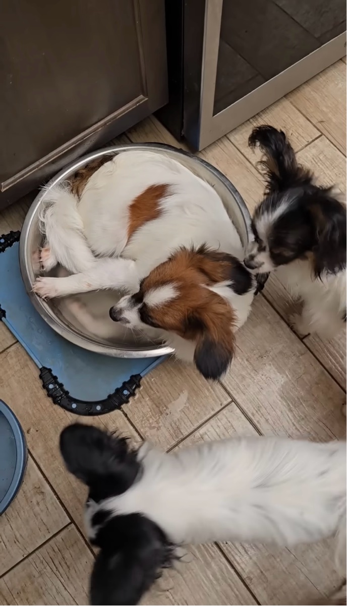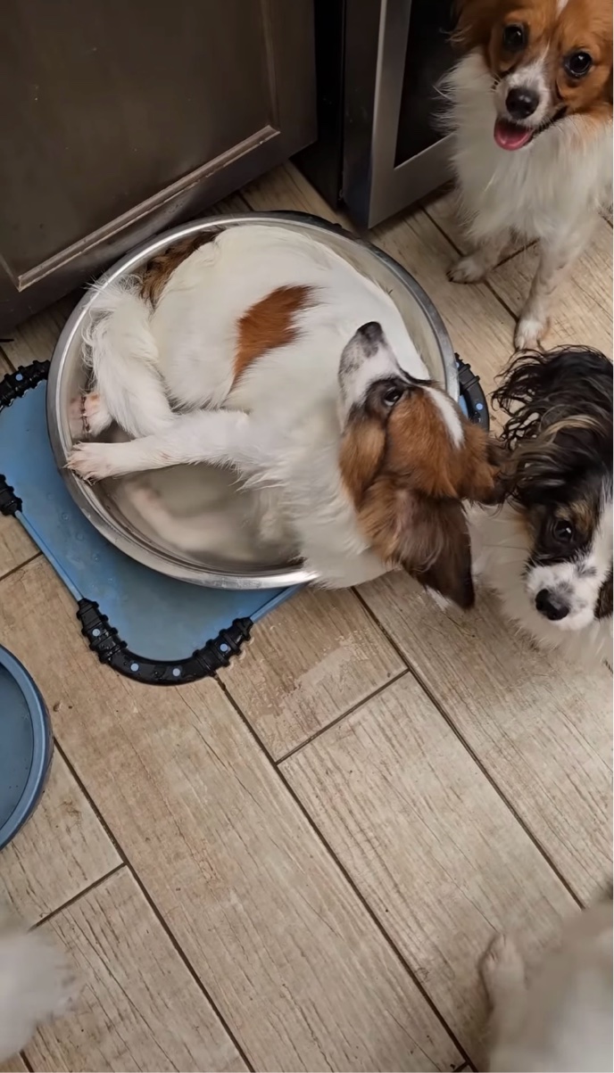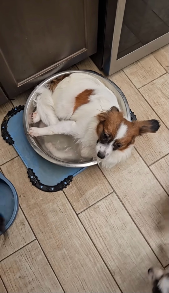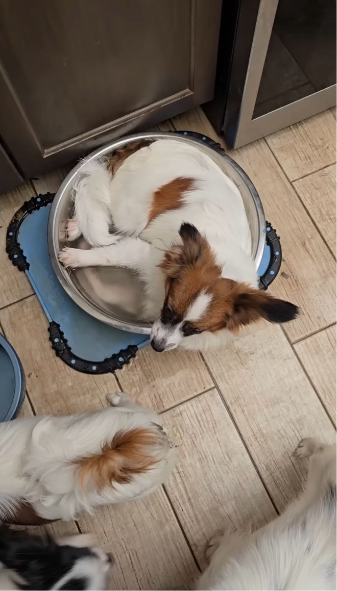 ウォーターボウルに体を丸めてすっぽり入っていたイヌ。