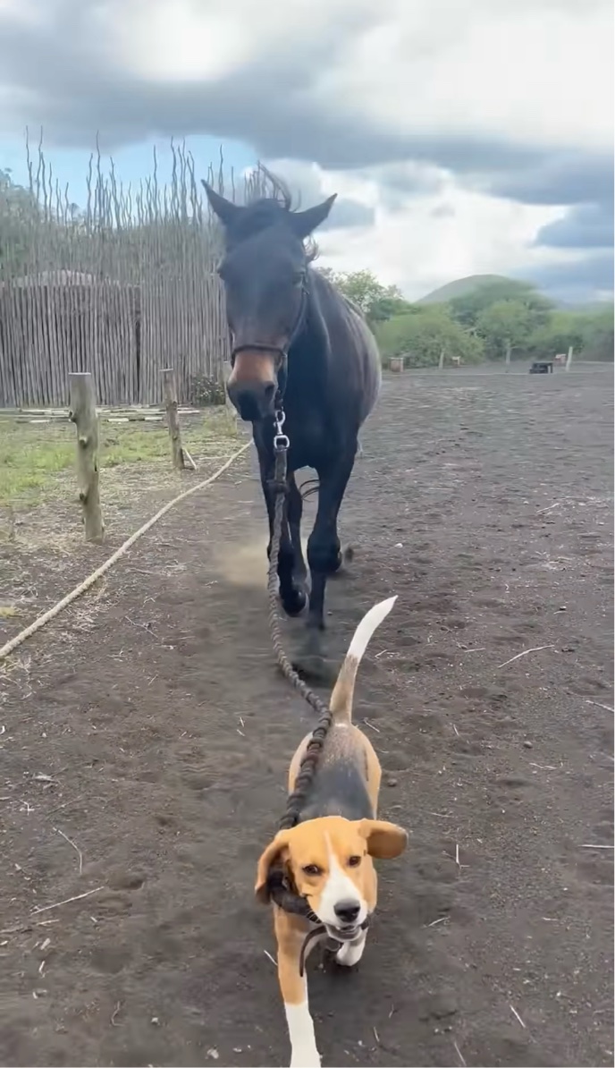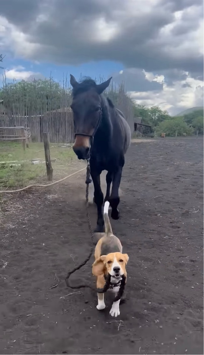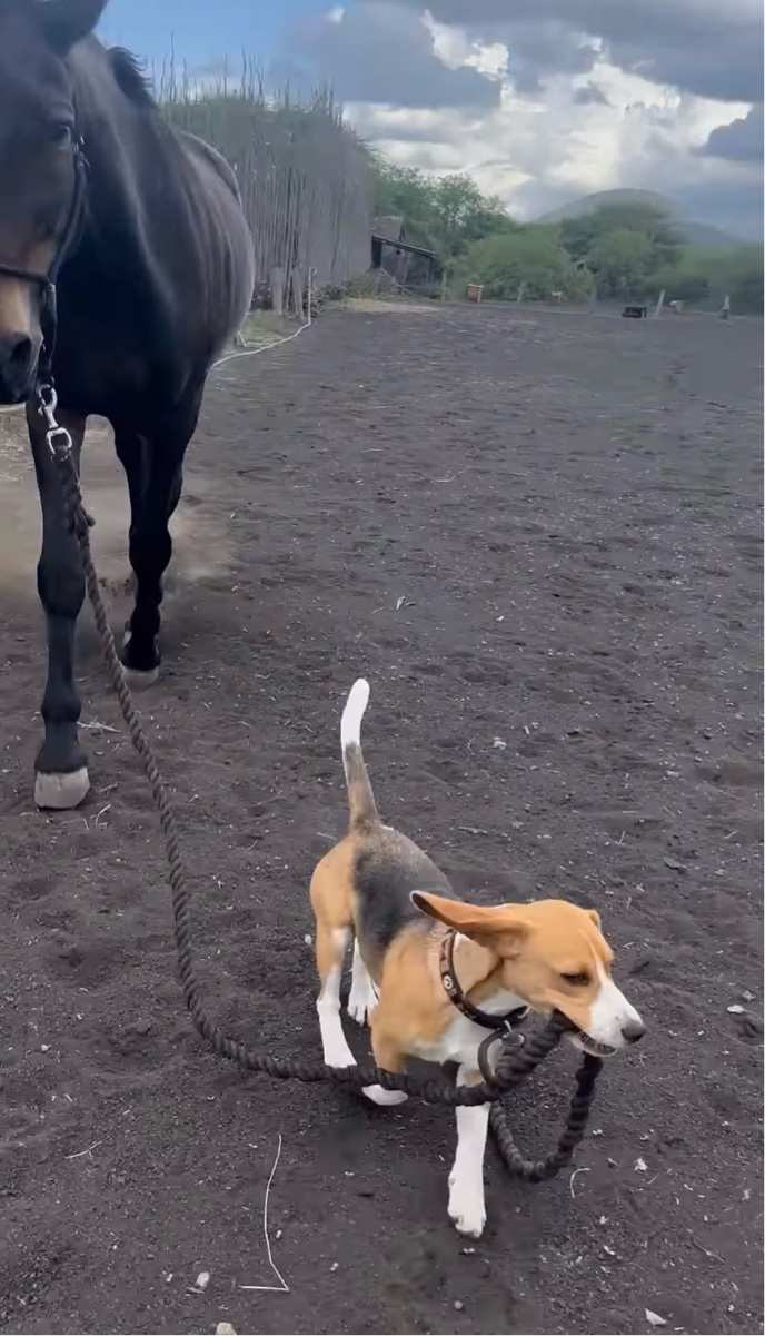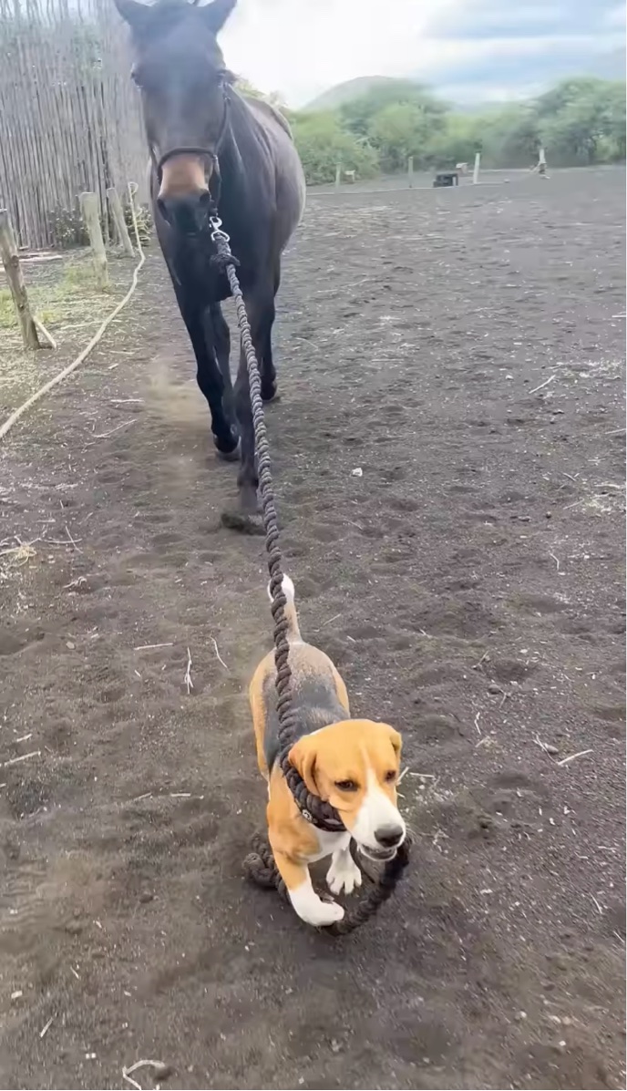 ビーグル犬の子犬・バケットは、その小さな体で馬の手綱をぐいぐい引っ張り、上手に先導しています。