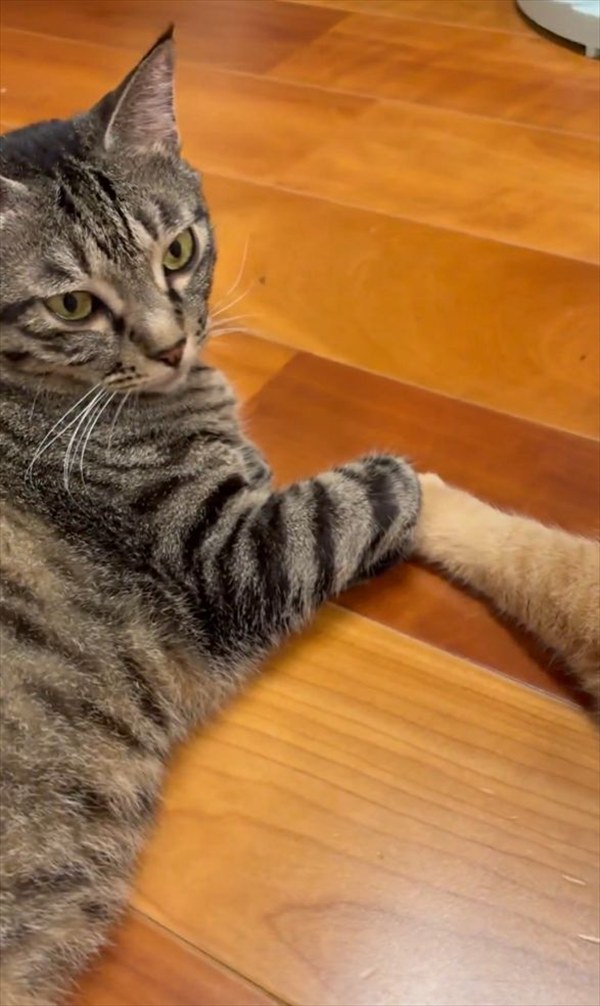 どうやら、ふうかちゃんは別のネコとおててを重ねているようです。