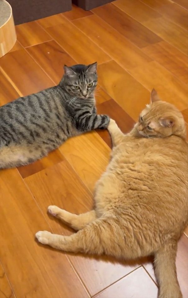 床に寝転がり仲良く一緒にくつろいでいるネコたち。