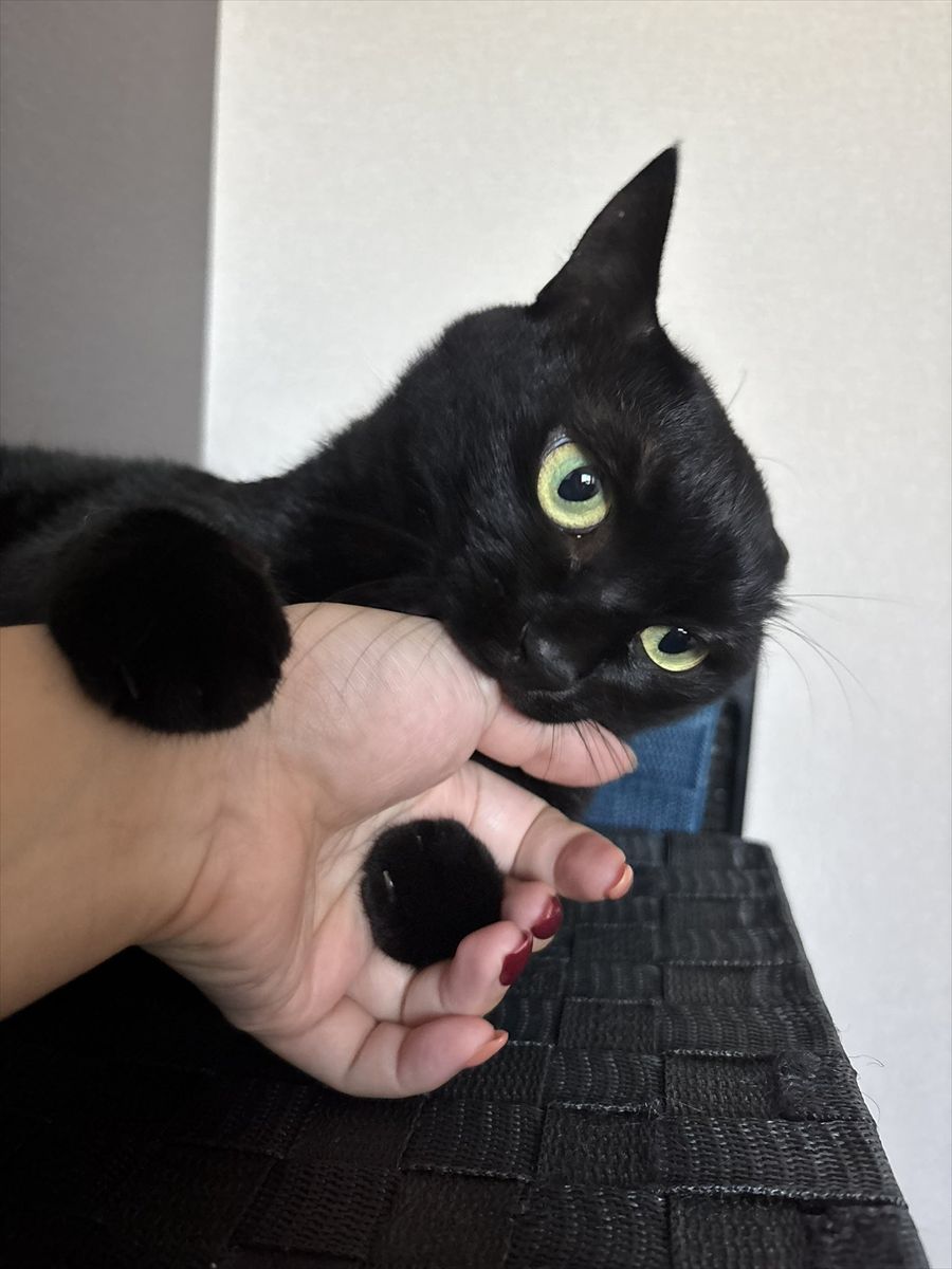 飼い主さんの手にしがみついているこの子は、黒猫の『あさり』ちゃん。