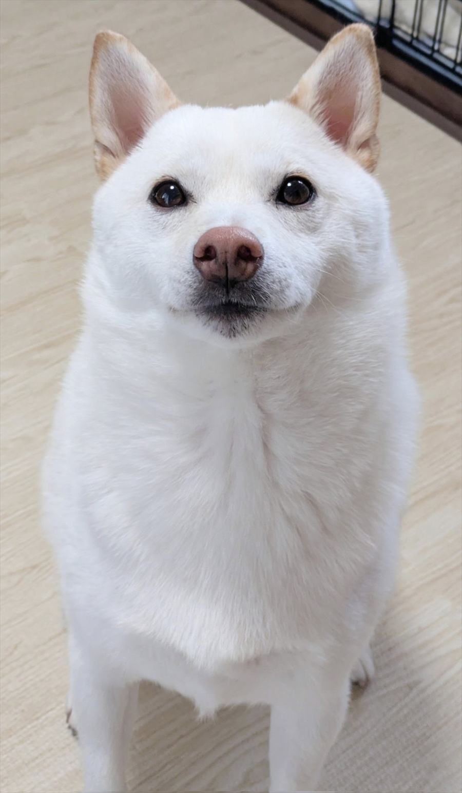 目を輝かせて飼い主さんを見つめるこの子は、白柴の『まんまる』くん。