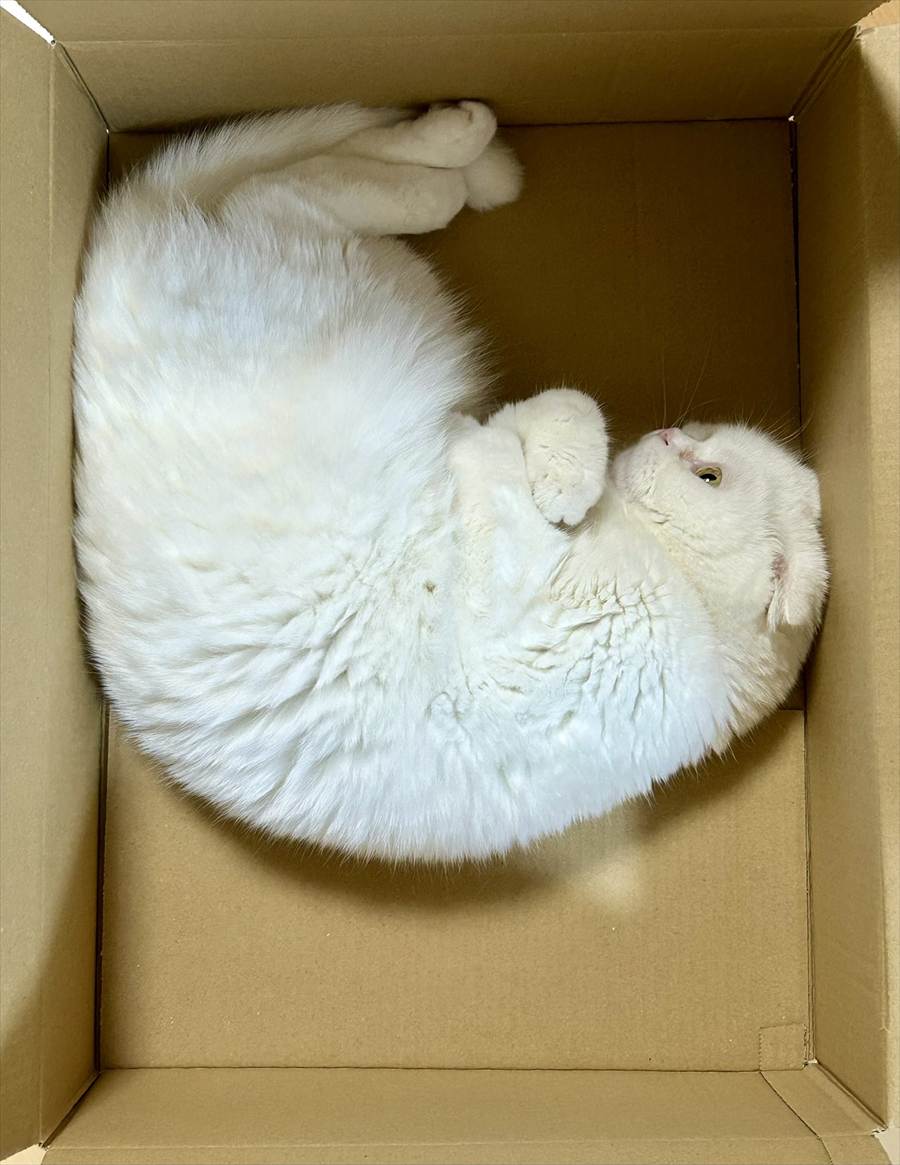 体を丸めて箱に入っているのは、愛猫のスコティッシュフォールド『むく』くん。