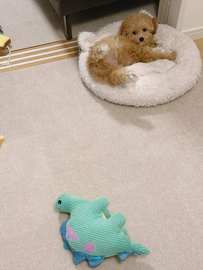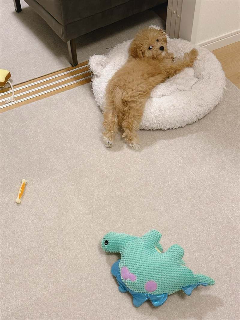 クッションに横になっているのは、マルチーズとトイプードルのミックス、マルプーの『からあげ』ちゃんです。