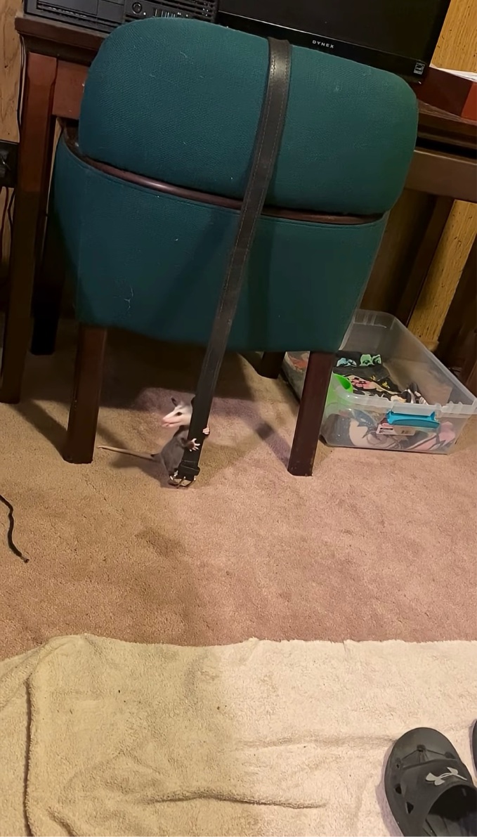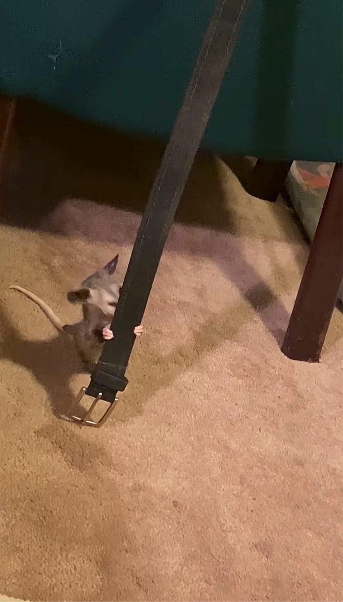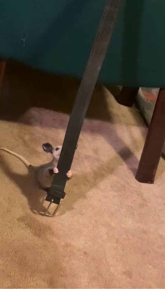 椅子に掛けられたベルトにおててを伸ばしているオポッサムの赤ちゃん。