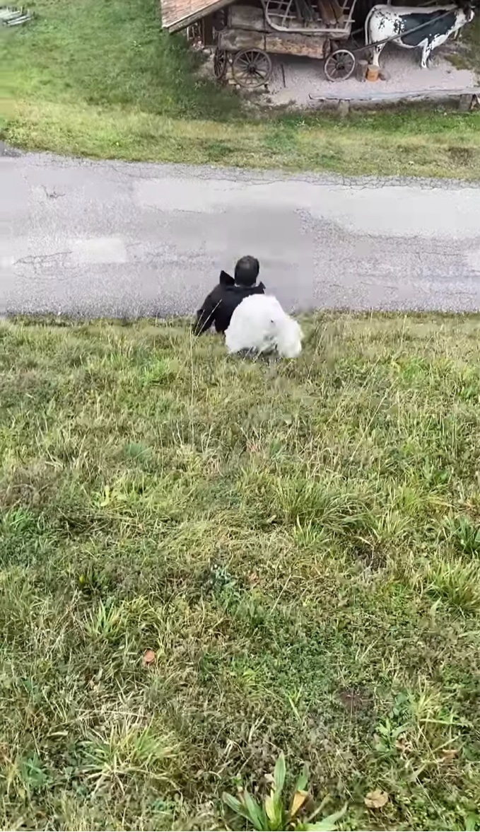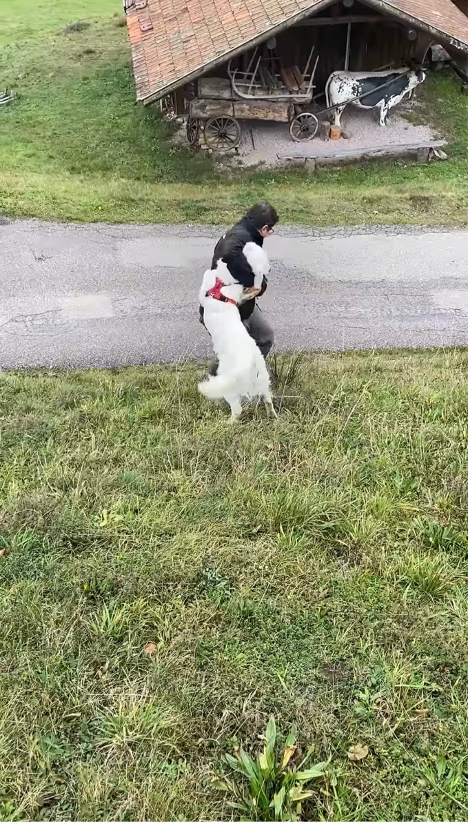 斜面で体格のいい愛犬が抱きついてきたら、こんな展開になるのも無理ありませんね!