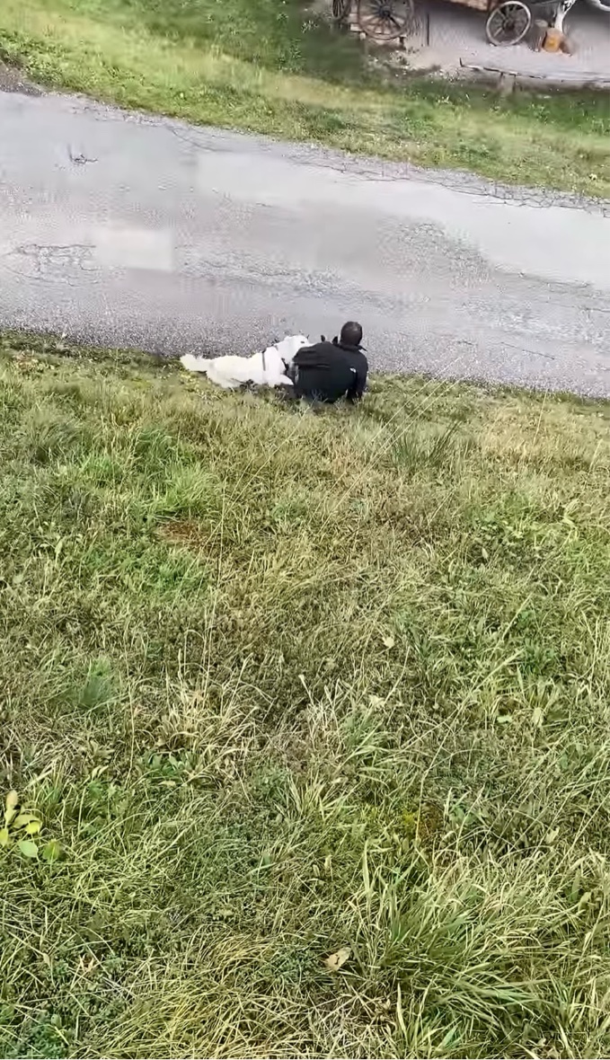 抱きついていた愛犬も離れることなく、斜面をコロコロと転がっていきます。