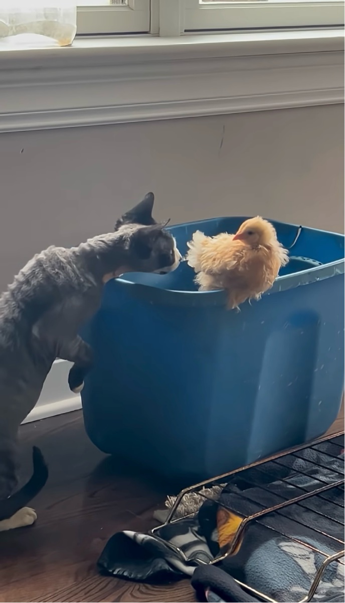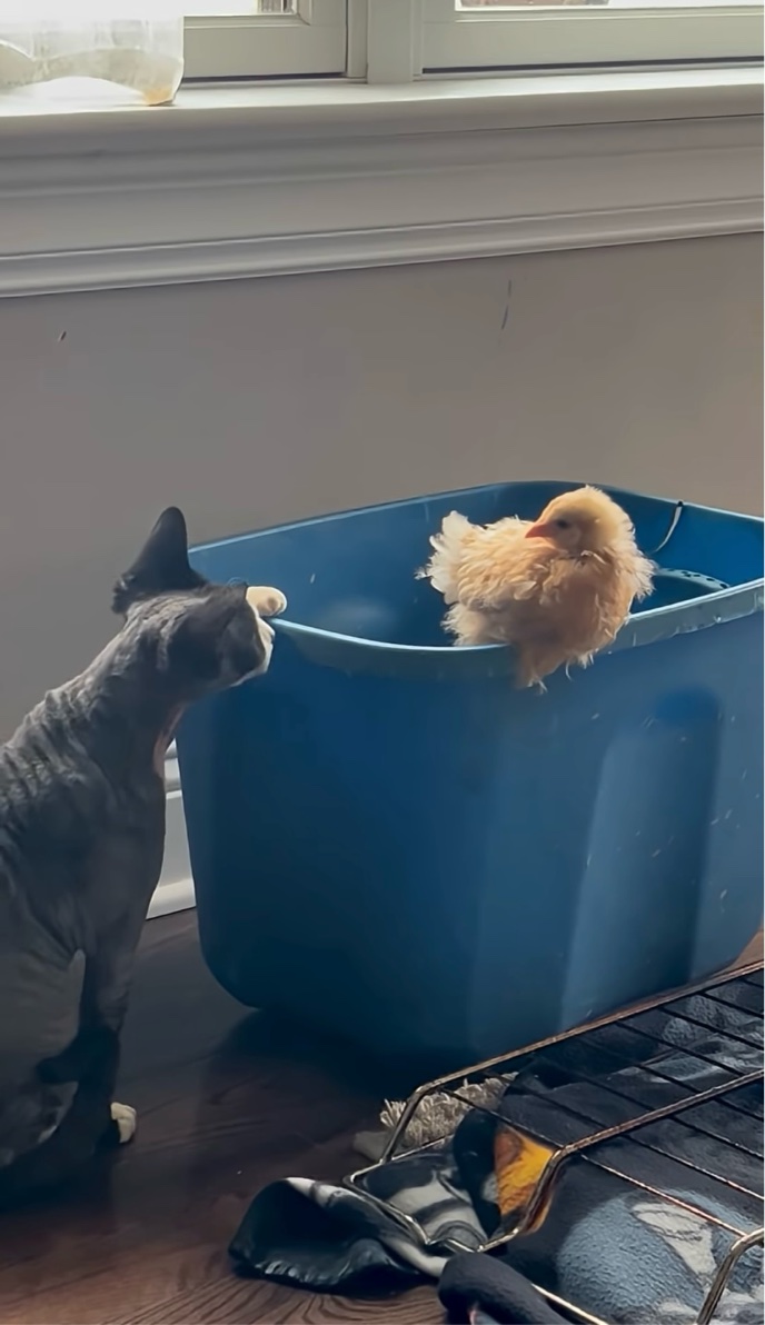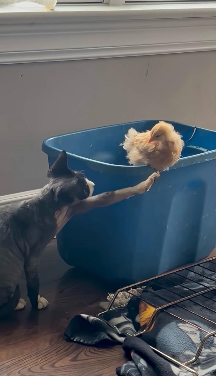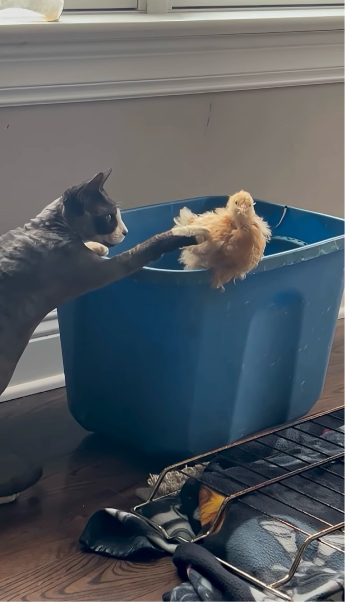 どうやらネコは、箱の枠にちょこんと座っているヒヨコのことが気になって仕方ないようです。