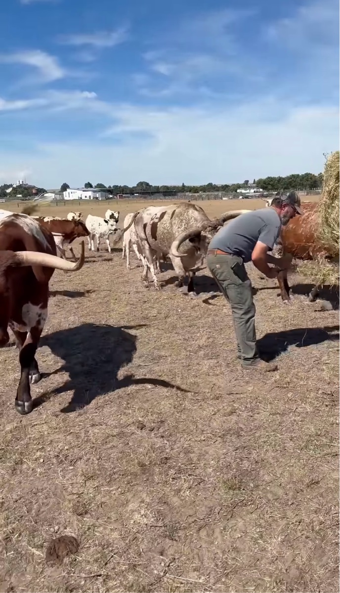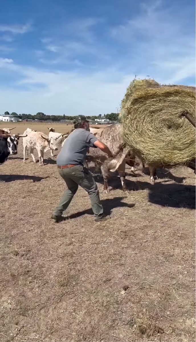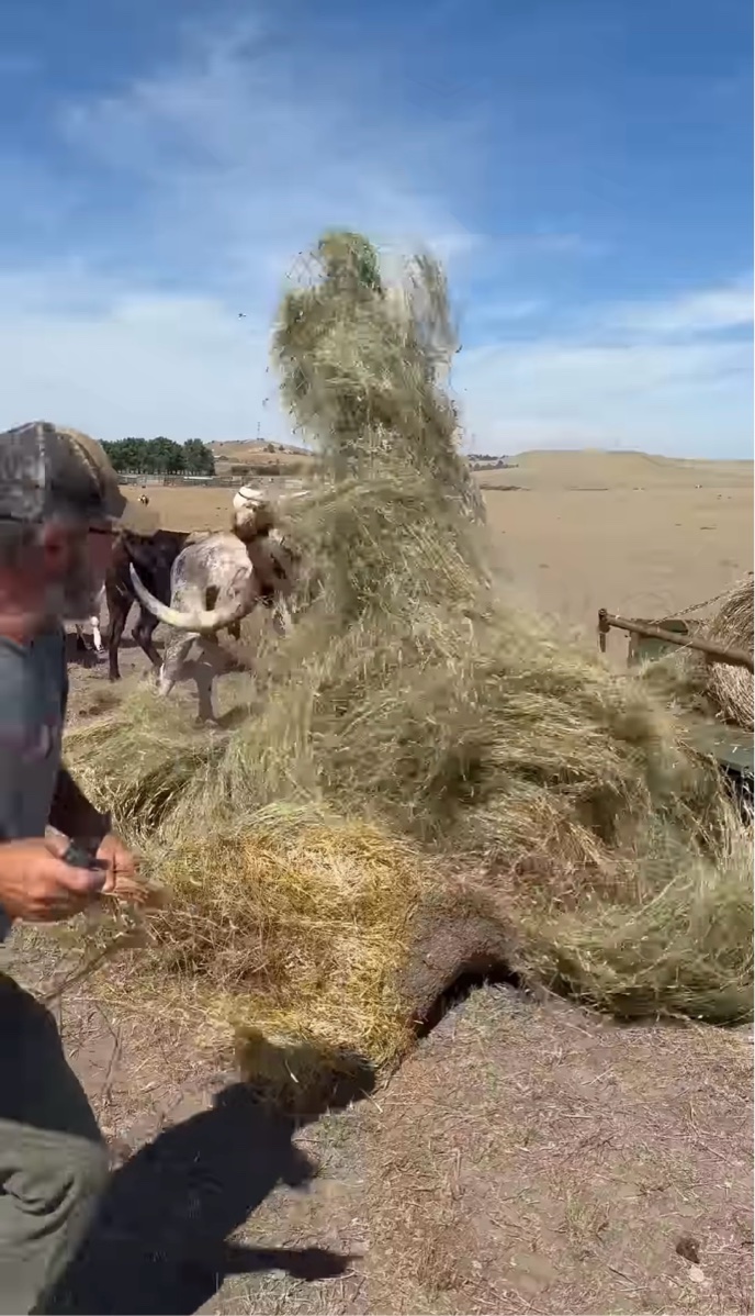 すると、この雄ウシは立派な角で干し草を思いきり突き差しました!