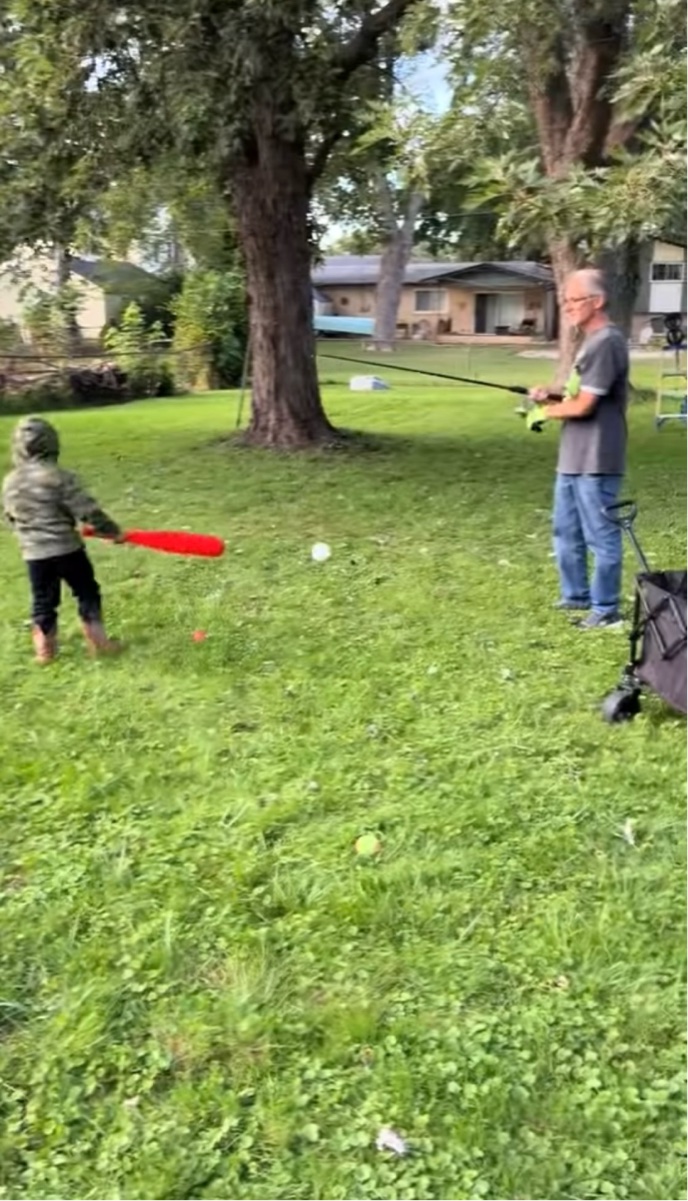 おじいちゃんと一緒にバッティング練習をする男の子。