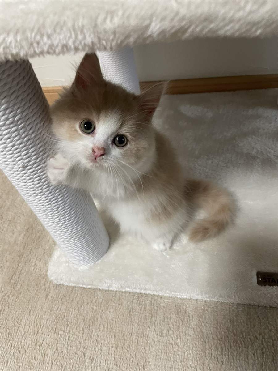 キャットタワーにつかまり立ちしながら見上げてくる姿。