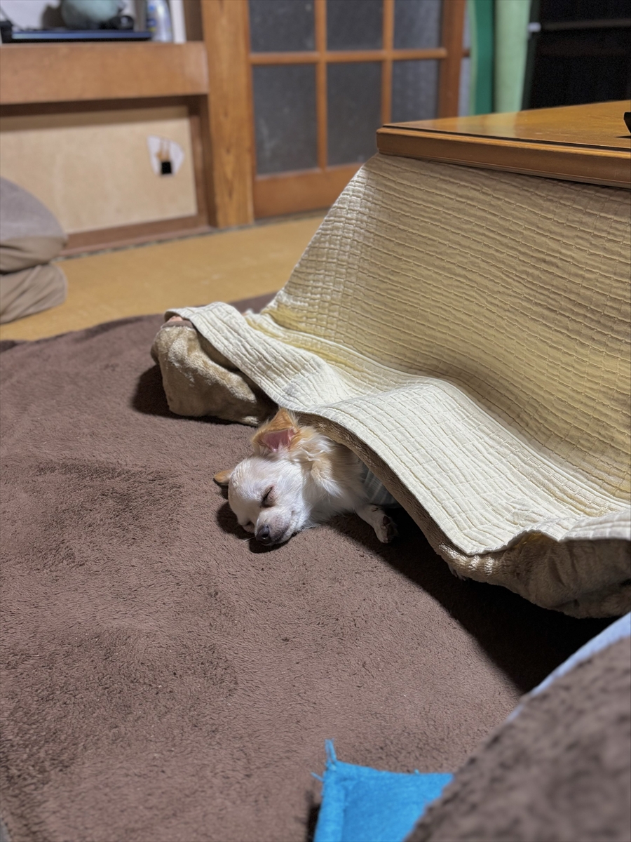 この日、生まれて初めてこたつに入ったそうですが、すっかり気に入ったようです。