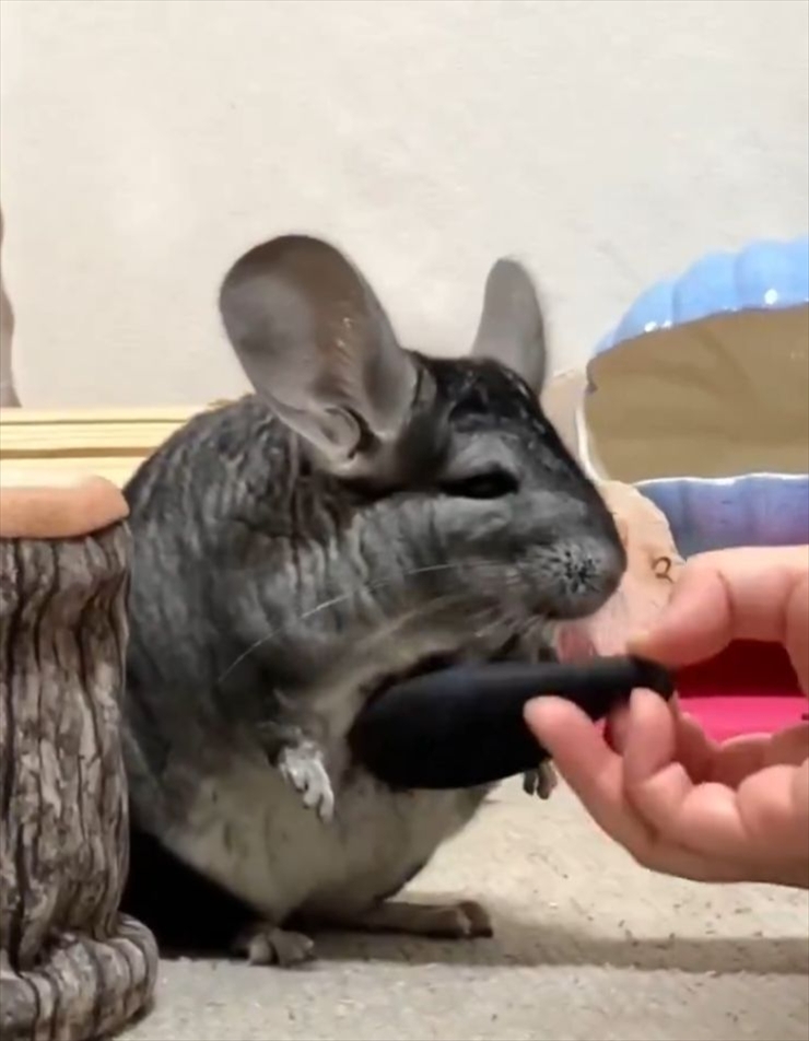 マッサージをしてもらい、気持ち良さそうにしているチンチラ。
