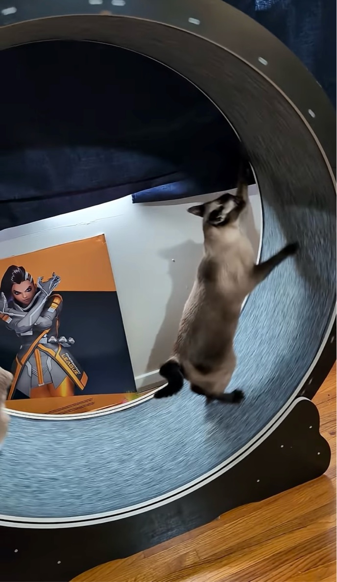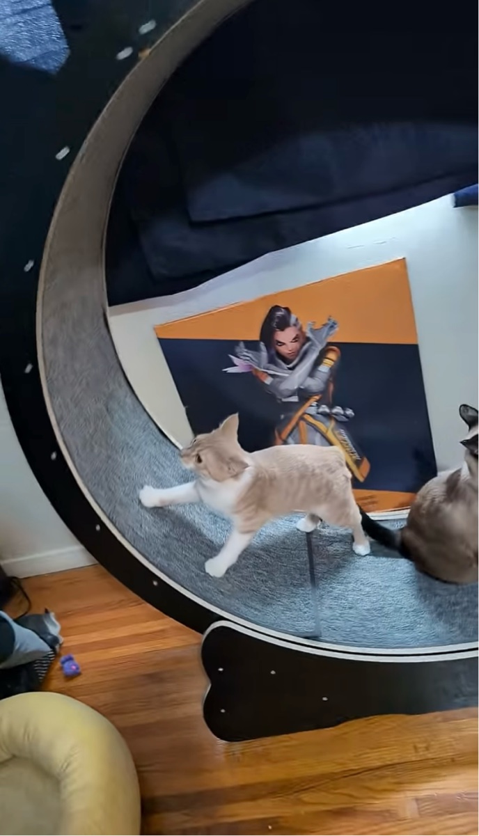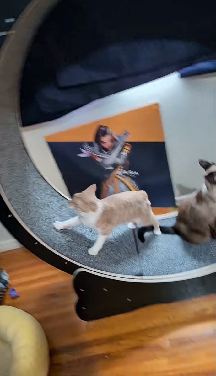 走ったり歩いたりして遊べる回転式運動器具「キャットホイール」の上にネコが2匹。
